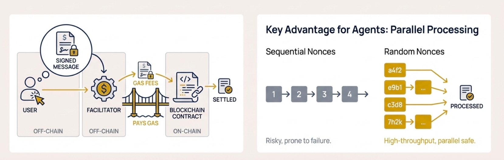 - Workflow: The Client signs an off-chain authorization. The Facilitator aggregates these authorizations and settles them in a batch at a later time.