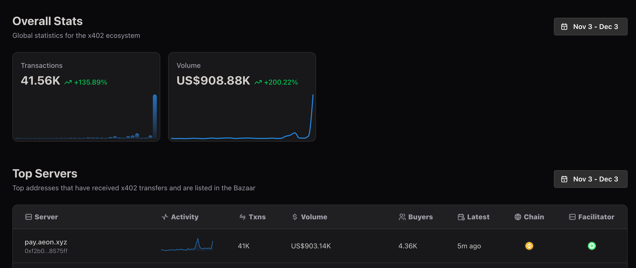 On BNB Chain, the ecosystem is somewhat isolated from Base and Solana. Its main facilitator is built by AEON, and statistics and explorer tooling are maintained separately from x402Scan’s primary dashboards.