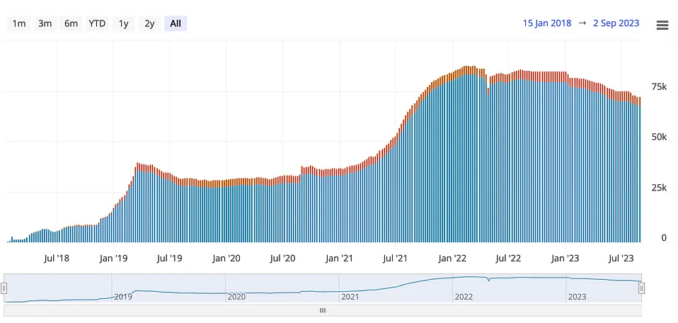 Currently, there are 16,241 nodes, 68,135 channels existing on Lightning Network. And Lightning Network holds 4,690 BTC. That’s 117M TVL if we assume BTC is $25,000. If we are looking back at the whole history, blue line is the TVL counting in USD, we don’t see significant drops like EVM ecosystem, the solid background of Bitcoin supports the Network’s value. From another perspective, orange line is the capacity counting in BTC. It’s a much more steady growth trend even in the bear market. In some well-known retracement of the whole market, Lightning Network seems not to be affected.