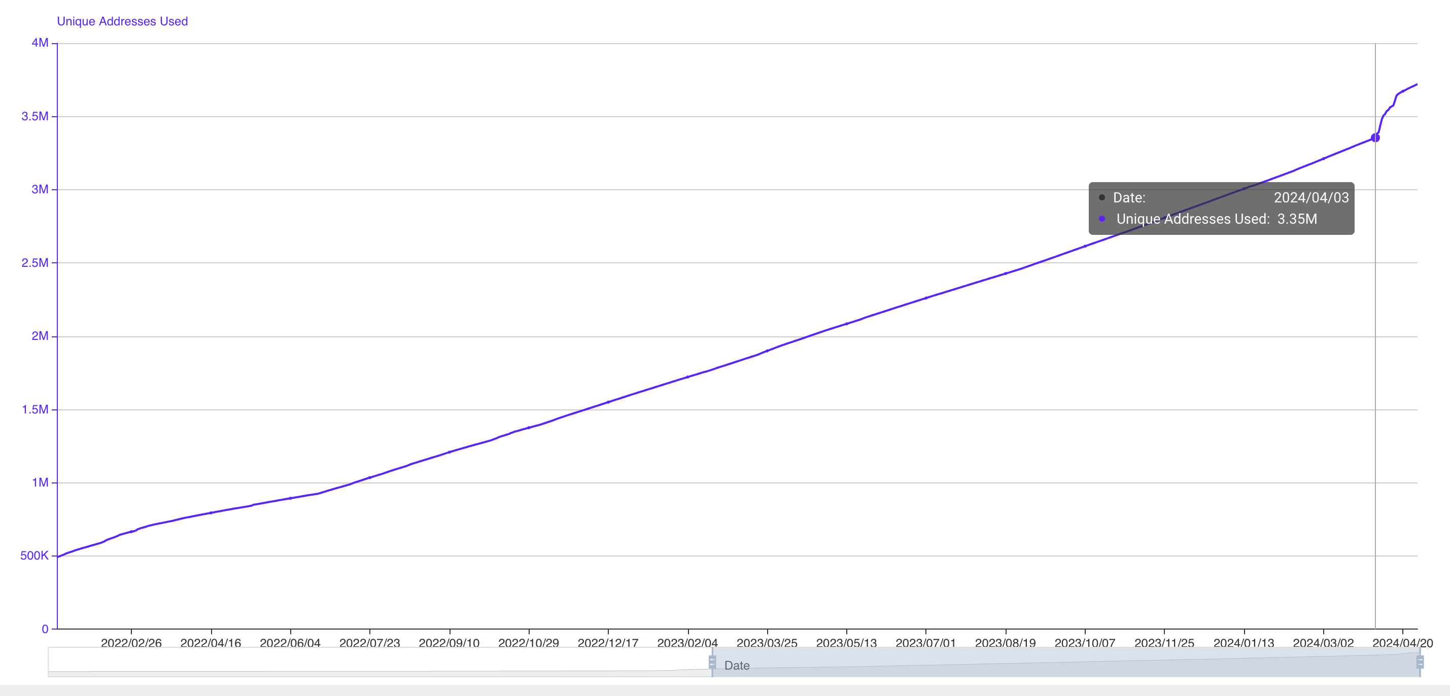 Between April 3, 2024, and April 3, 2024, there was a noticeable rise in the number of addresses, from 3.35 million to 3.66 million. This surge indicates that the wave of RGB++ has led to approximately 310,000 new addresses being created.