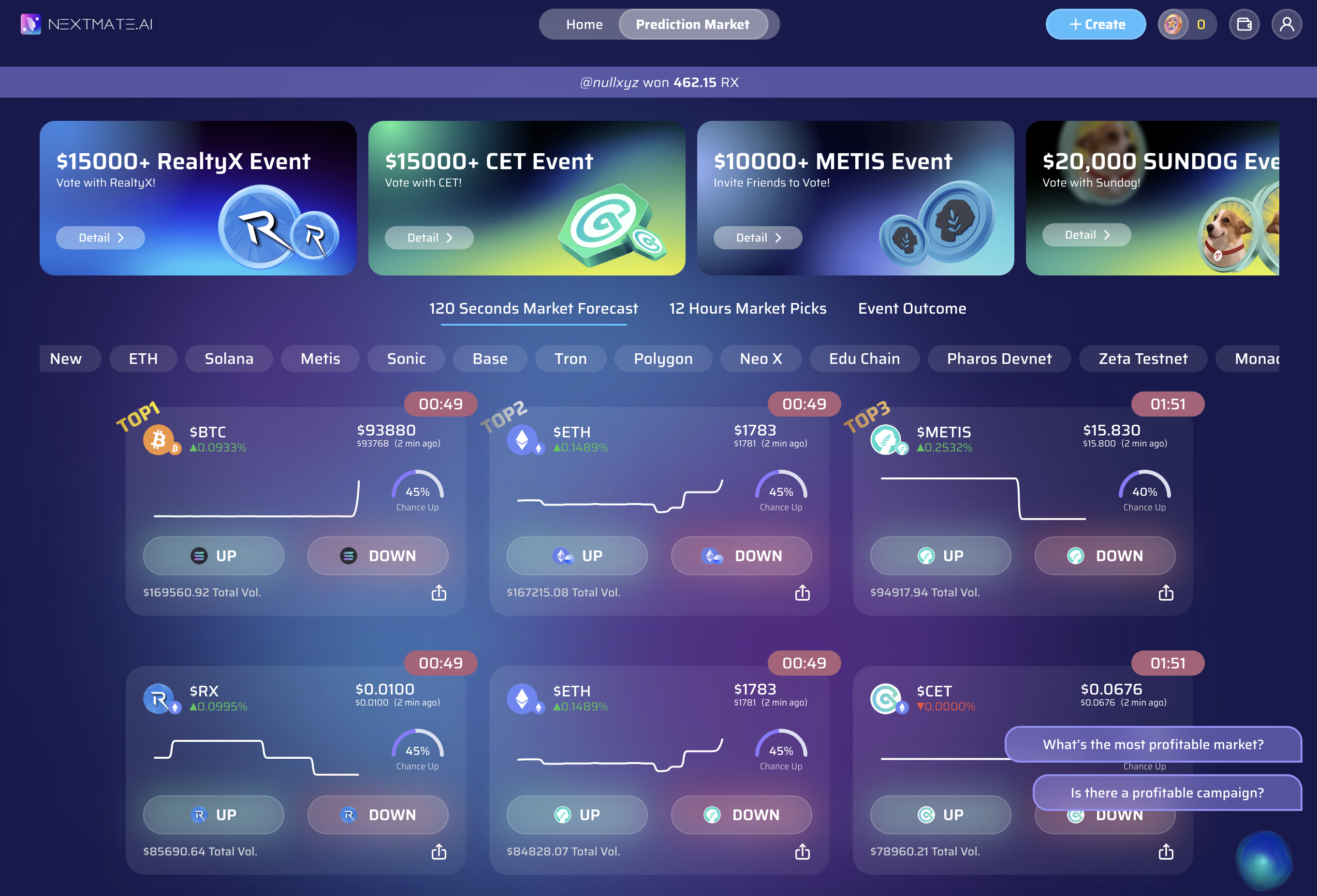 - AI Agent -> Prediction market. Token, MEME, Events. The key model is Bet2Earn, and project give out tokens, and provide yield, user buy token to bet. Project get volume, Nextmate get revenue.