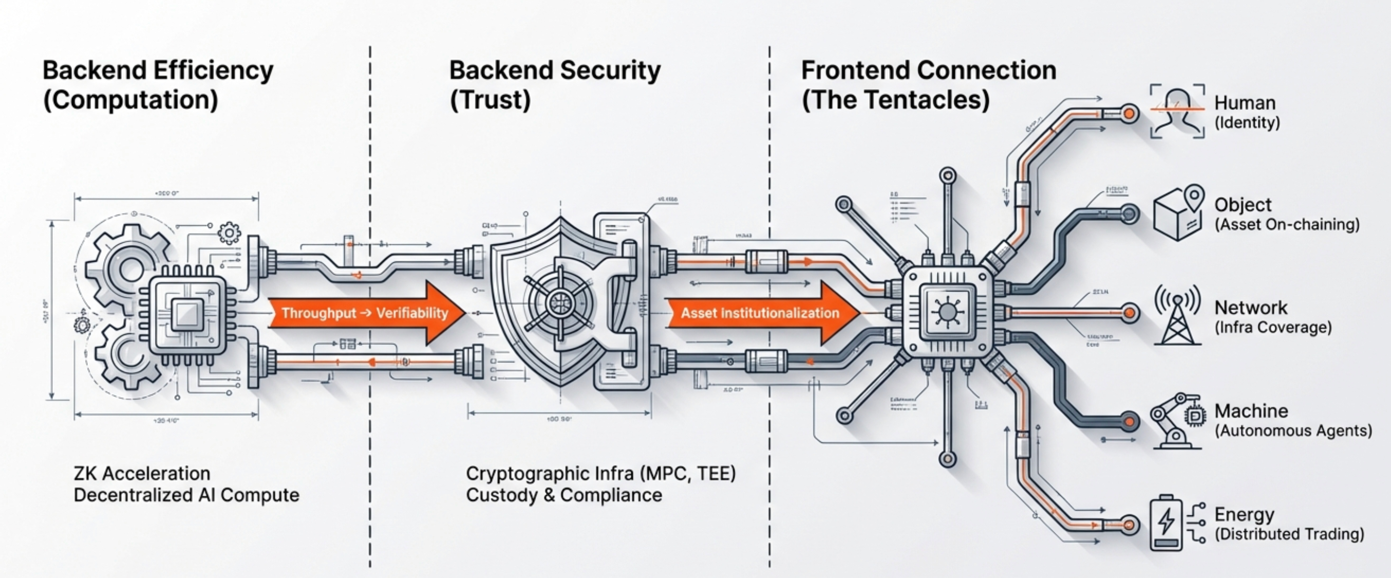 The simplest classification standard is the vertical perspective based on the industry chain and customer segmentation. In terms of industry links, Foundational Compute (Chip Layer) is the bedrock of the entire industry. Whether for institutional custody or DePIN, everything ultimately relies on performance breakthroughs in specialized chips (ASIC/FPGA/TEE). This reveals the "Hard Tech" attribute of this sector.