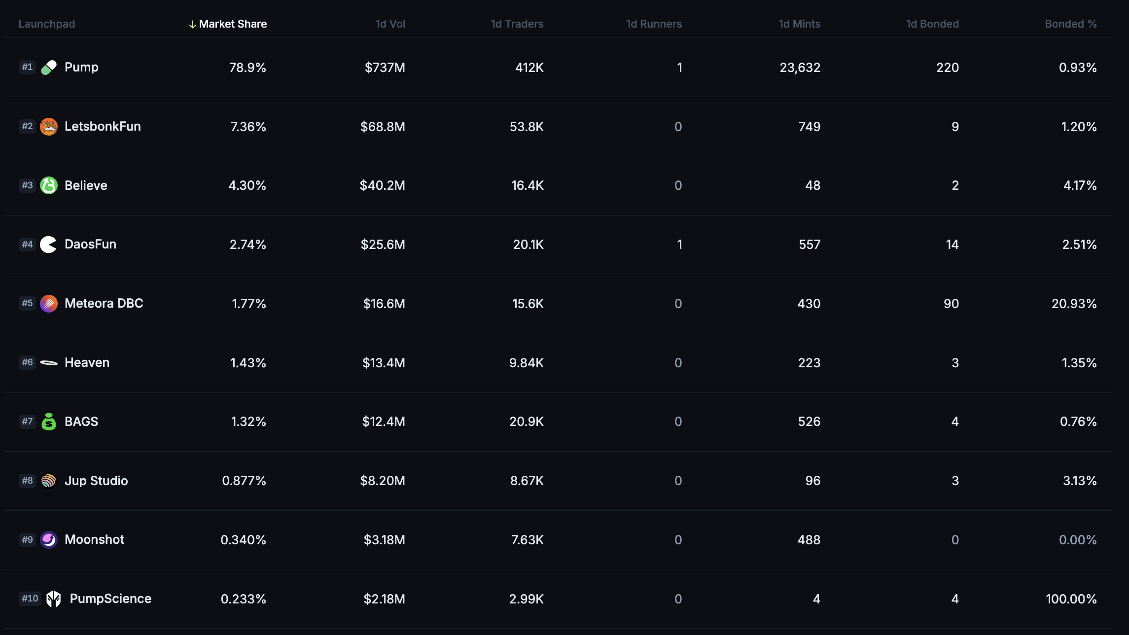 - Controls ~79% of total daily volume, almost 11x larger than LetsbonkFun.