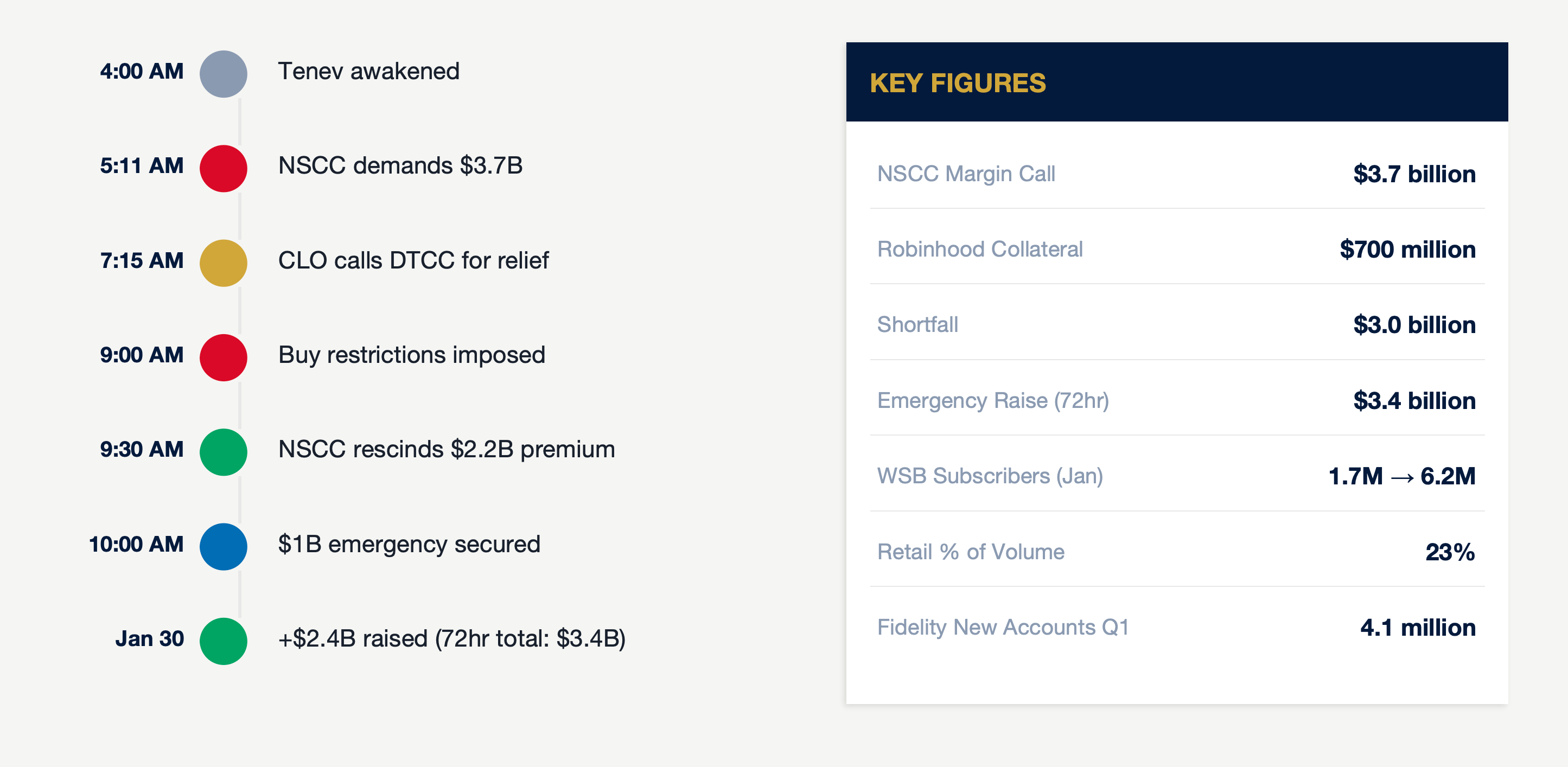 CEO Vlad Tenev was awakened around 4 AM Pacific. CLO Dan Gallagher — a former Republican SEC commissioner — called a deputy general counsel at the DTCC at 7:15 AM ET requesting relief. Robinhood restricted meme stock buying, which prompted the NSCC to rescind the $2.2 billion Excess Capital Premium by mid-morning, reducing the call to ~$1.4 billion. CFO Jason Warnick secured $1 billion in emergency investment by the 10 AM deadline. By January 30, Robinhood raised an additional $2.4 billion, totaling $3.4 billion in 72 hours — more than it had raised since founding in 2013. The round was led by Ribbit Capital with participation from Andreessen Horowitz, Sequoia, and ICONIQ, structured as 6% convertible debt converting at a 30% discount to the eventual IPO price.