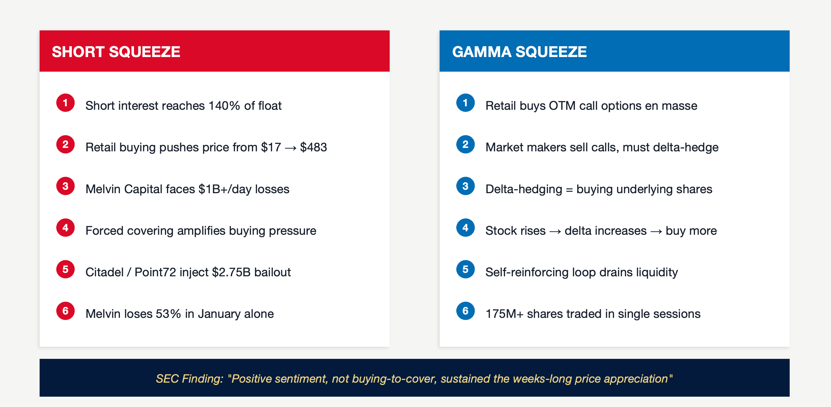 The 45-page SEC Staff Report released October 18, 2021, documented that individual accounts trading GME surged from under 10,000 to nearly 900,000 during January 2021, while short interest reached 122.97% of float. Its most consequential finding: "It was the positive sentiment, not the buying-to-cover, that sustained the weeks-long price appreciation." The report explicitly stated neither a short squeeze nor gamma squeeze was the primary driver — a conclusion that drew sharp academic pushback. A six-member Ad Hoc Academic Committee including Columbia's Joshua Mitts published a rebuttal on SSRN arguing that "a nontrivial fraction of the trading volume consisted of purchases by short sellers covering their positions."