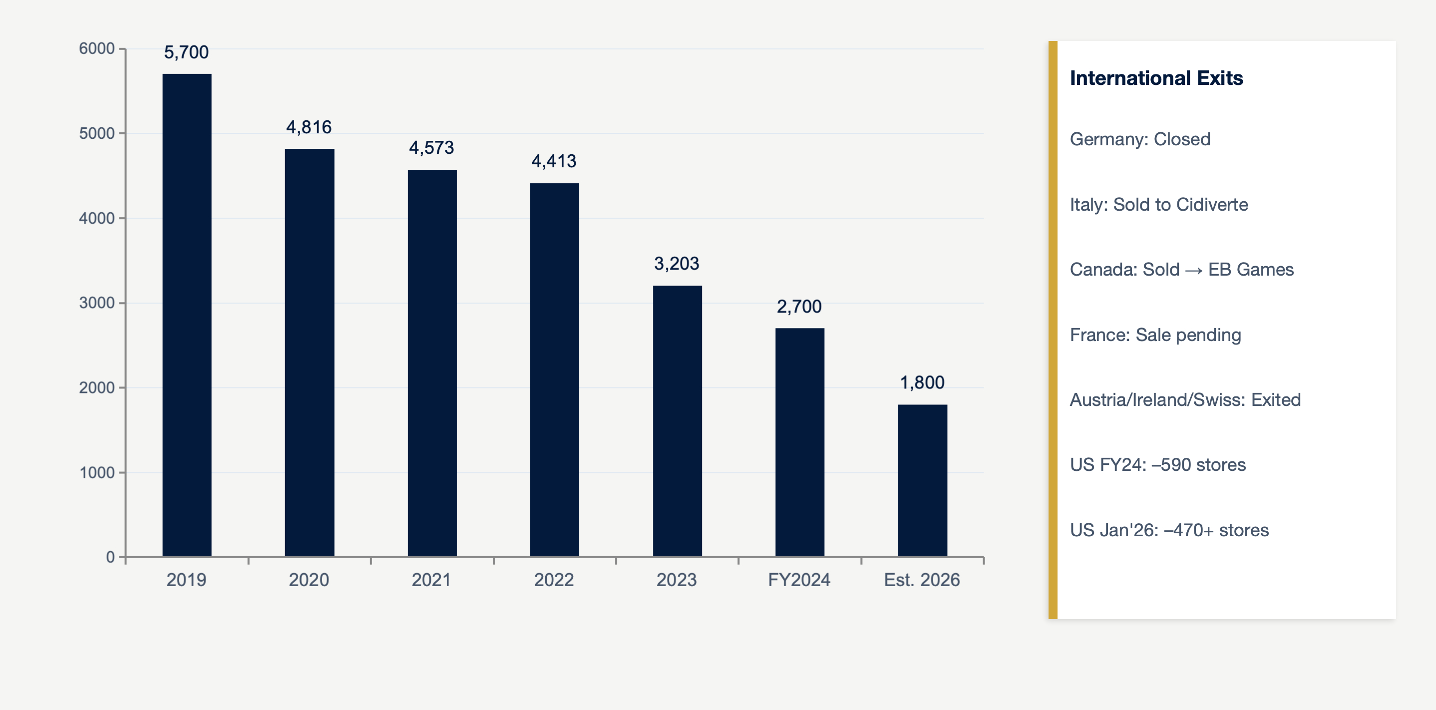 GameStop has aggressively implemented the retreat and divestiture of its international businesses. The company sequentially exited European markets such as Ireland, Switzerland, and Austria. In Q2 of FY25, it divested operations in Canada and sold its Italian business, while also planning to sell its French operations in 2026 and close its EB Games stores in New Zealand, consolidating its core foundations entirely into the higher-margin US domestic and Australian markets. This contraction strategy led to a massive 44% year-over-year decline in Selling, General and Administrative expenses (SG&A) (down from $1.7 billion to $951 million), vastly improving operating cash flow.