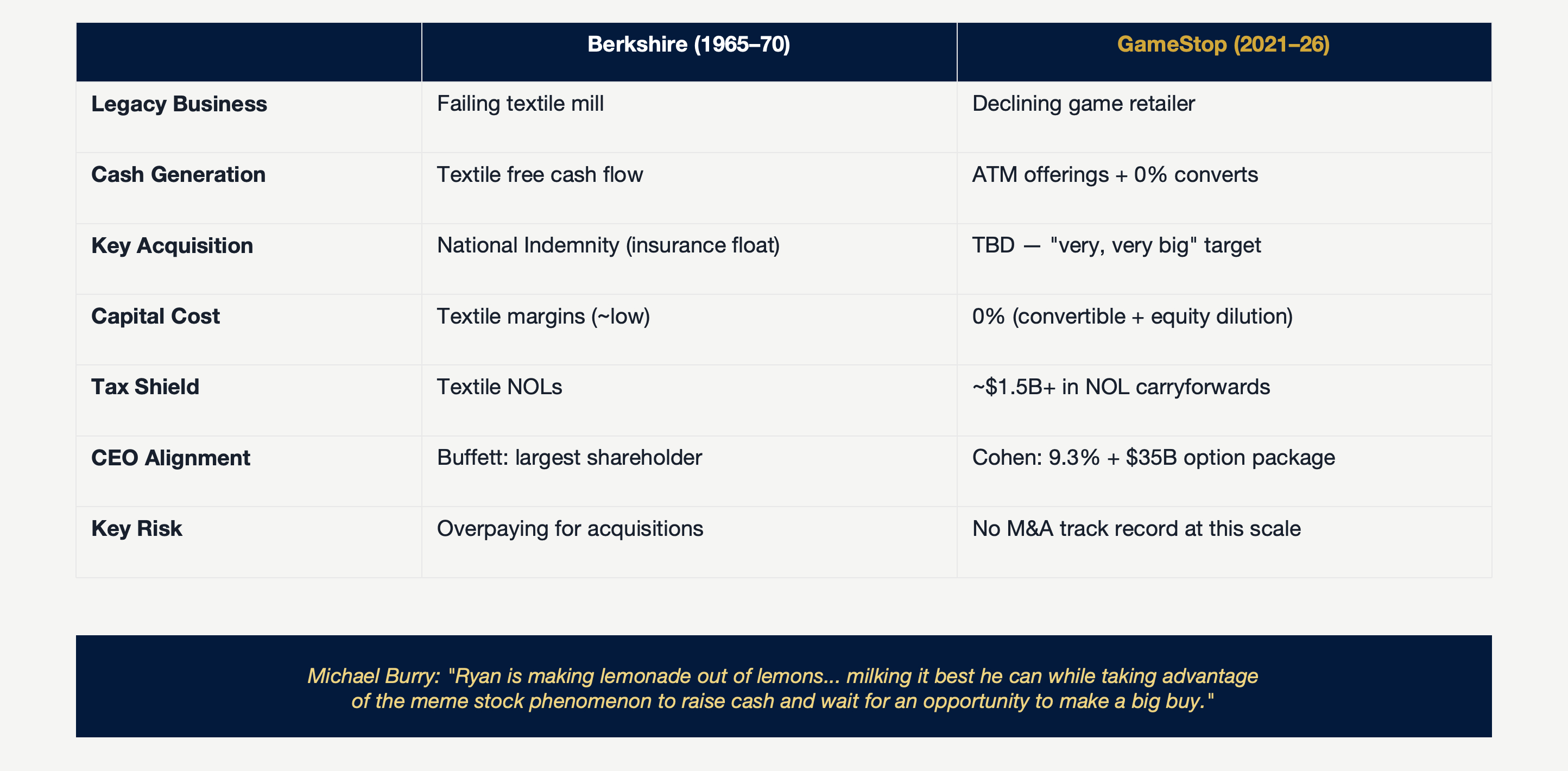 Burry's core argument: "Ryan is making lemonade out of lemons. He has a crappy business, and he is milking it best he can while taking advantage of the meme stock phenomenon to raise cash and wait for an opportunity to make a big buy of a real growing cash cow business." He coined the term "Instant Berkshire" — defined as "creating a portfolio of great companies that generate excess capital or float for additional investment beyond what is required for their growth."