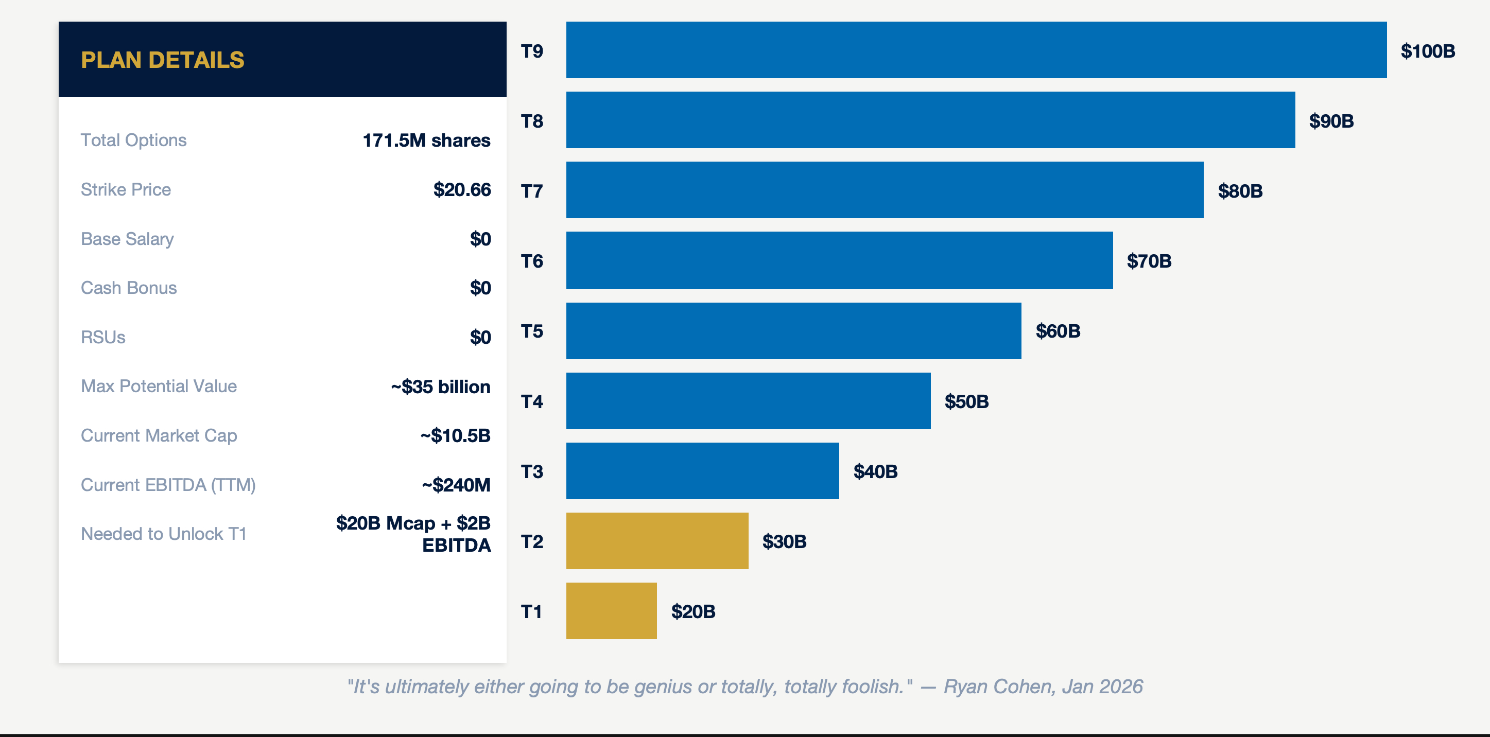 Cohen owns approximately 42.1 million shares (~9.3% of outstanding) through RC Ventures, with an estimated net worth of $4.7-5.6 billion. His compensation package, approved by the board on January 6, 2026, grants options on ~171.5 million shares at $20.66, vesting across nine tranches requiring simultaneous achievement of market cap hurdles ($20B to $100B) and cumulative EBITDA targets ($2B to $10B). Maximum potential value: ~$35 billion. Cohen told the WSJ this will be "either going to be genius or totally, totally foolish." A shareholder vote is expected at a special meeting in March or April 2026. Given retail investors' dominance of the float, approval appears likely despite the package's extreme ambition.
