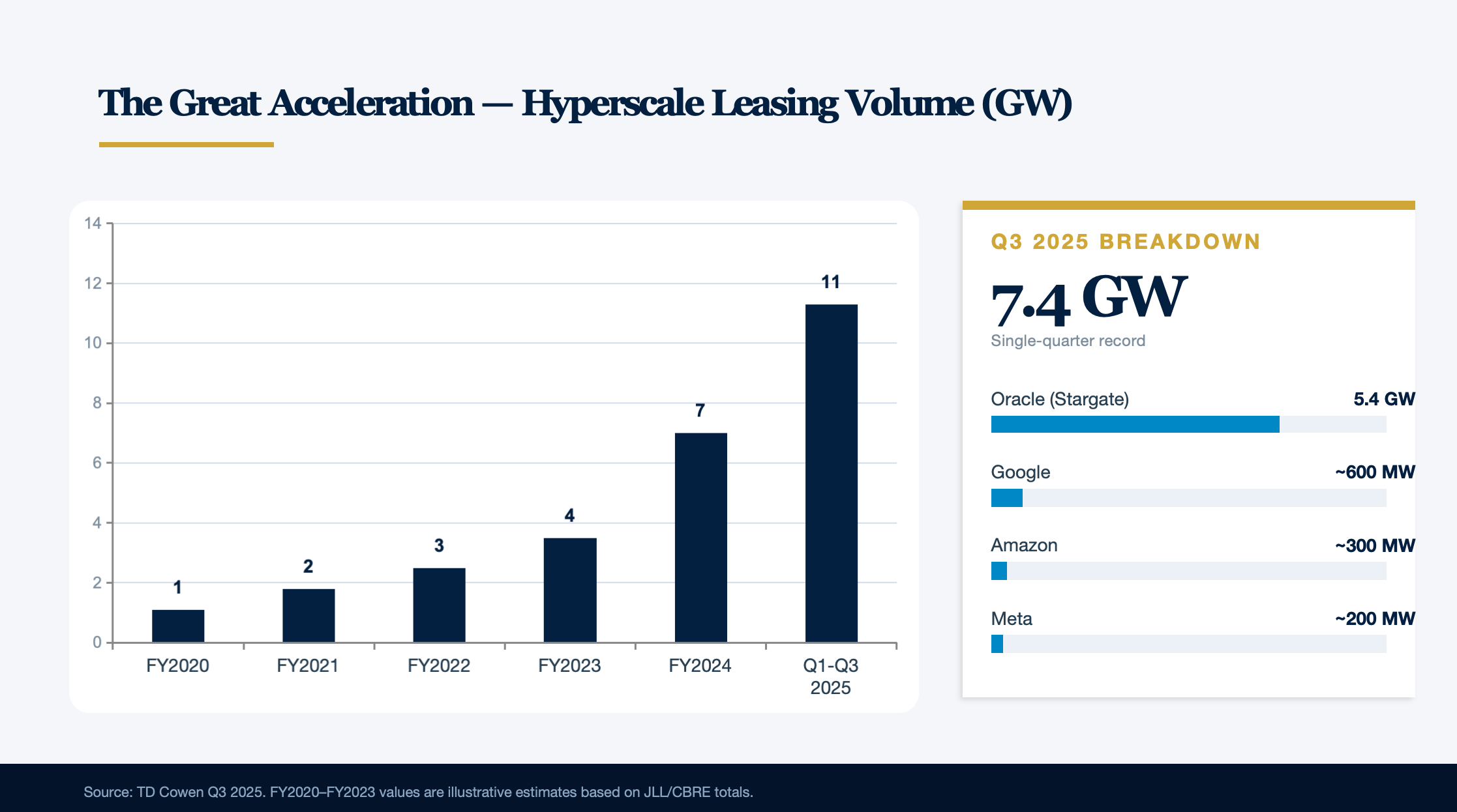The "Great Acceleration" in hyperscale leasing. TD Cowen confirmed that Q3 2025 single-quarter leasing volume reached 7.4 GW — exceeding the full-year 2024 total of 7 GW. Oracle accounted for 5.4 GW (supporting Stargate), Google ~600 MW, Amazon ~300 MW, and Meta ~200 MW. The first three quarters of 2025 aggregated to 11.3 GW. TD Cowen called this "the most significant demand inflection since the data center industry's inception."