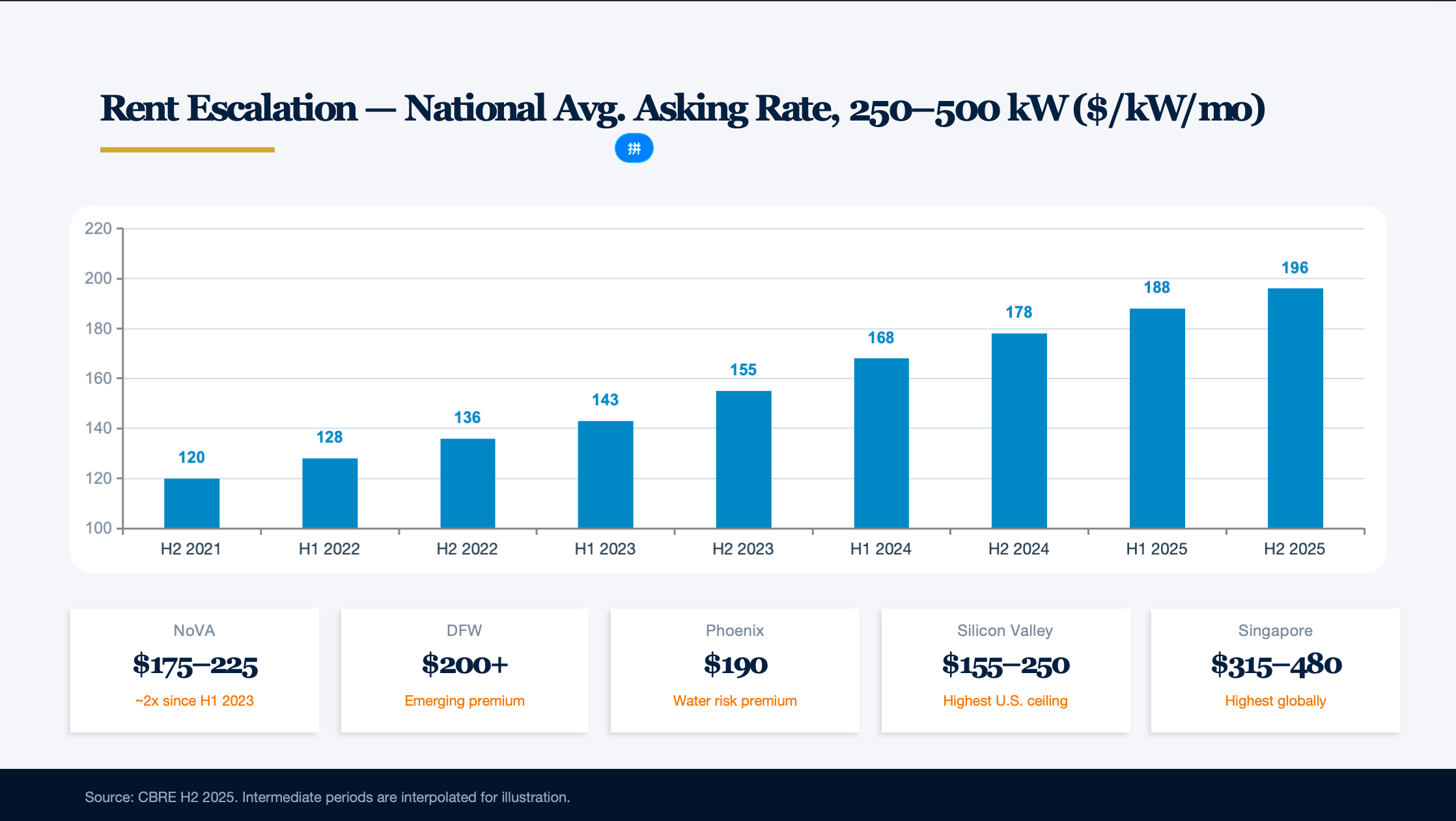 Rents continue to climb. The national average asking rate for 250–500 kW demand rose from approximately $120/kW/month in H2 2021 to $195.94/kW/month in H2 2025 (CBRE) — a 63%+ increase over four years and the fourth consecutive year of growth. Large-block 10–30 MW demand saw even steeper 19% increases. NoVA wholesale rents broke through $215/kW/month in Q2 2025 — a new all-time high. CBRE expects rents to remain above $200/kW/month in 2026.