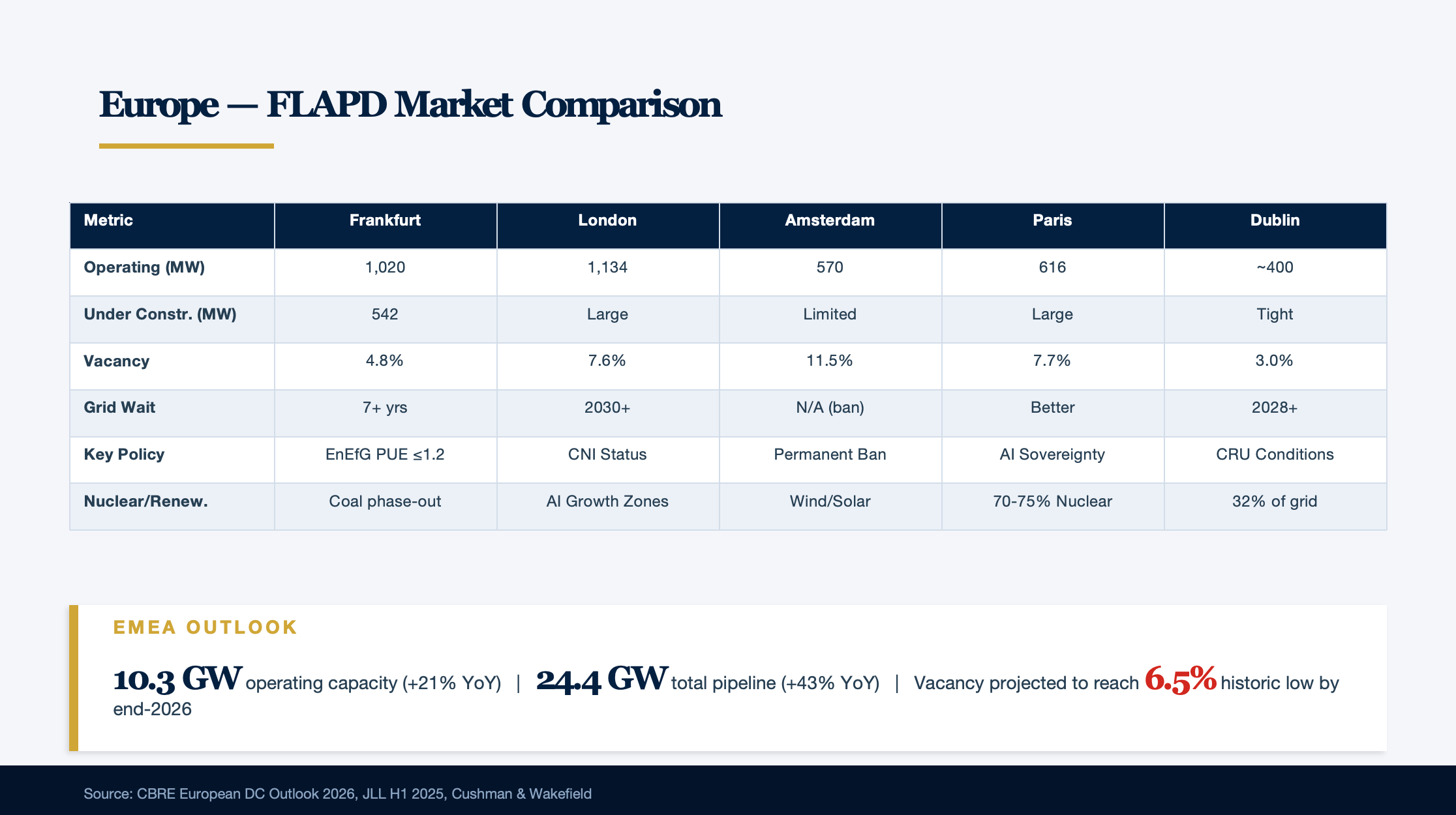 Frankfurt reached 1,020 MW of operating capacity (CBRE Q2 2025), becoming the second European city after London to breach 1 GW. Vacancy is 4.8%, projected to fall to 3.4% by year-end. Approximately 542 MW is under construction. Frankfurt faces unique regulatory pressure — Germany's Energy Efficiency Act (EnEfG), effective September 2023, imposes strict requirements: new data centers must achieve PUE ≤ 1.2 by July 2026; 100% renewable energy supply by January 2027; and waste heat utilization ≥ 20% by July 2028. Grid interconnection wait times exceed 7 years, with some developers shifting 30–40 km west to find power. However, the 2025 CDU/SPD coalition agreement signals potential relaxation of PUE and waste heat requirements. Hyperscaler investment in Germany is substantial: Microsoft €3.2 billion, AWS €8.8 billion (through 2026), Google €5.5 billion (through 2029).