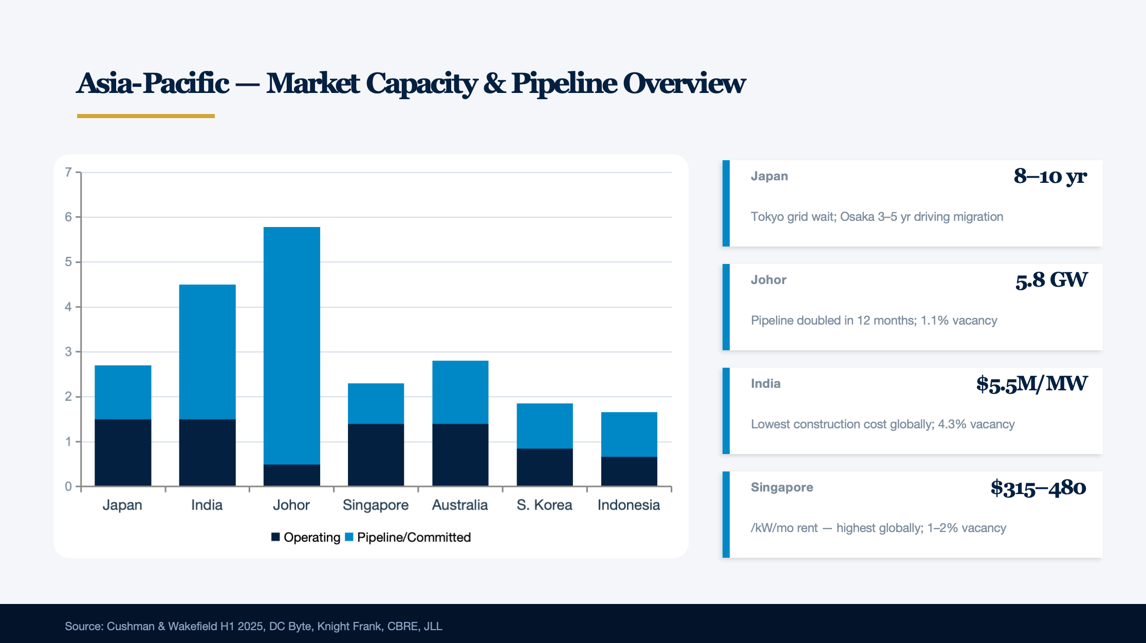 Asia-Pacific is experiencing the most dramatic data center expansion wave globally. Japan's construction pipeline exceeds 1.2 GW, Johor has 5.8 GW of committed capacity, and India's operational capacity has surpassed 1.5 GW — these three figures encapsulate a core reality: AI-driven compute demand is rewriting the Asia-Pacific data center map, creating a once-in-a-decade window for M&A investors.