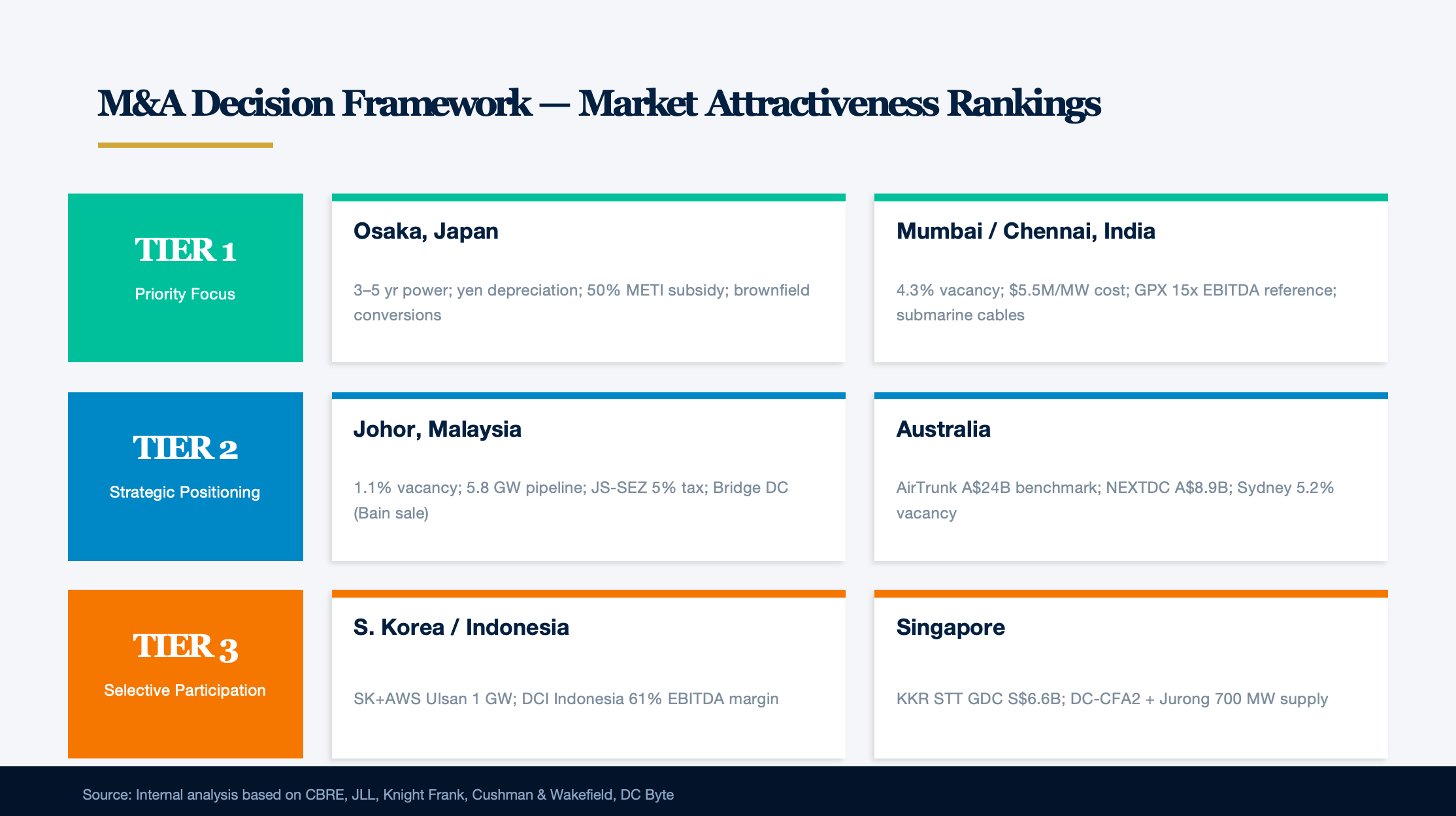 M&A opportunity assessment: Yen depreciation (2024–2025 range: 145–160), relatively reasonable asset valuations, and increasing asset-sale willingness from domestic companies (NEC has already divested data centers; Fujitsu and Hitachi may follow) create a favorable entry window for foreign investors. Osaka Bay Area brownfield conversions of former factory sites (with existing power capacity) offer a low-cost entry path. Tokyo central-area data center development land commands premiums of up to 770% (for power-secured parcels).