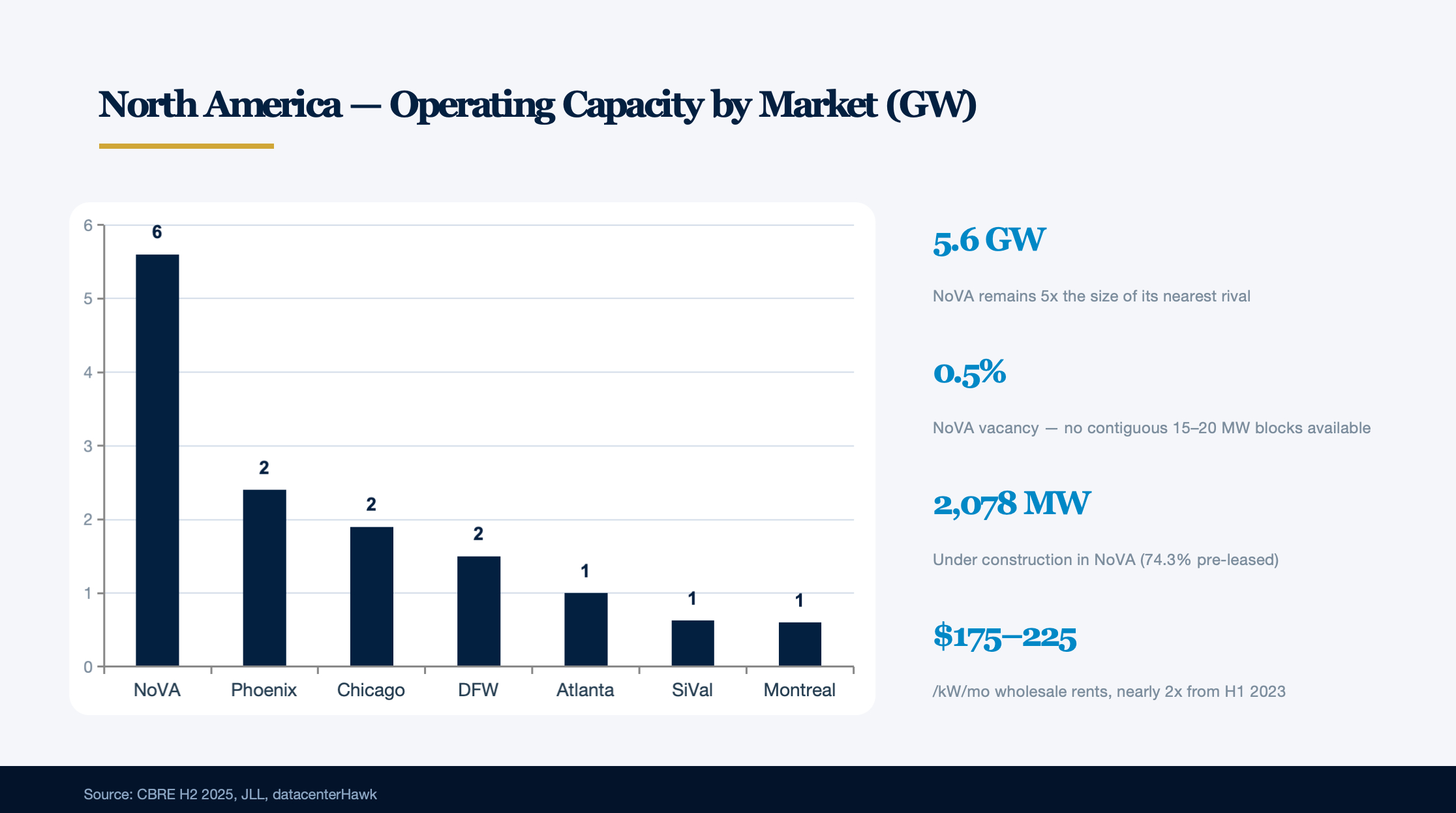 | Northern Virginia | 5.6 GW | 2,078 MW | 5.9 GW | 0.5% | $175–225 | 8–10 |