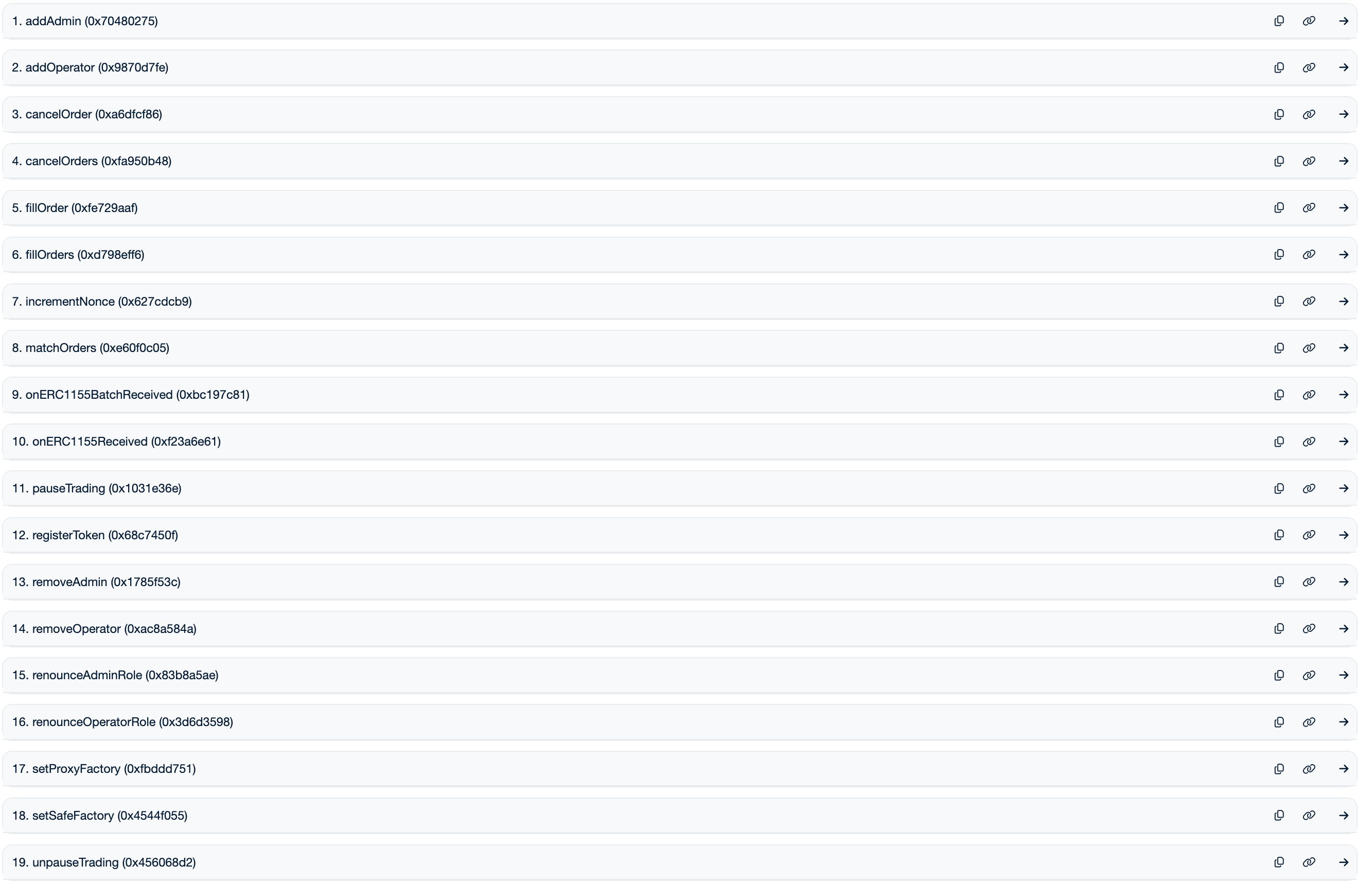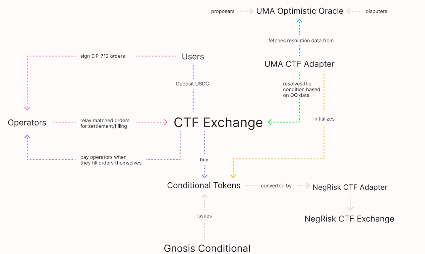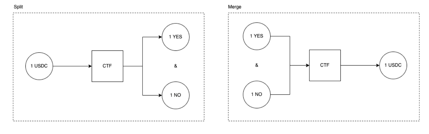 - NegRisk CFT Exchange: Mutually exclusive binary markets: break down complex scenarios into multiple yes/no questions, each focusing on a specific outcome. For instance, “Presidential Election Winner 2024” can be broken down into single questions, each for each candidate (”Will Harris win the 2024 US Presidential Election?” or “Will Donald Trump win the 2024 US Presidential Election?”), each supporting two possible outcomes.