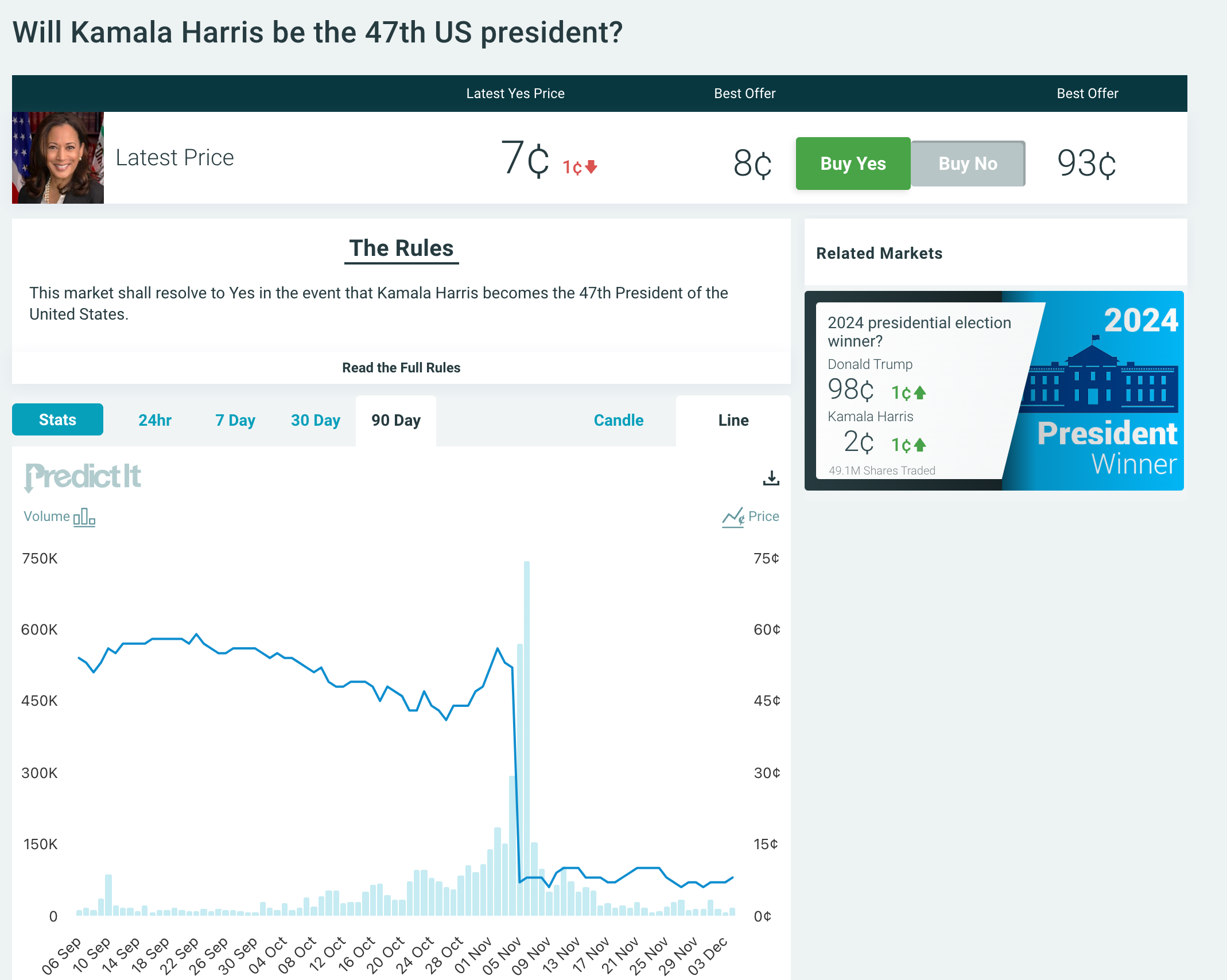 - The largest volume and open interest market now is Super Bowl Champion 2025, 800M. Compared to Election 2024, 3.5B