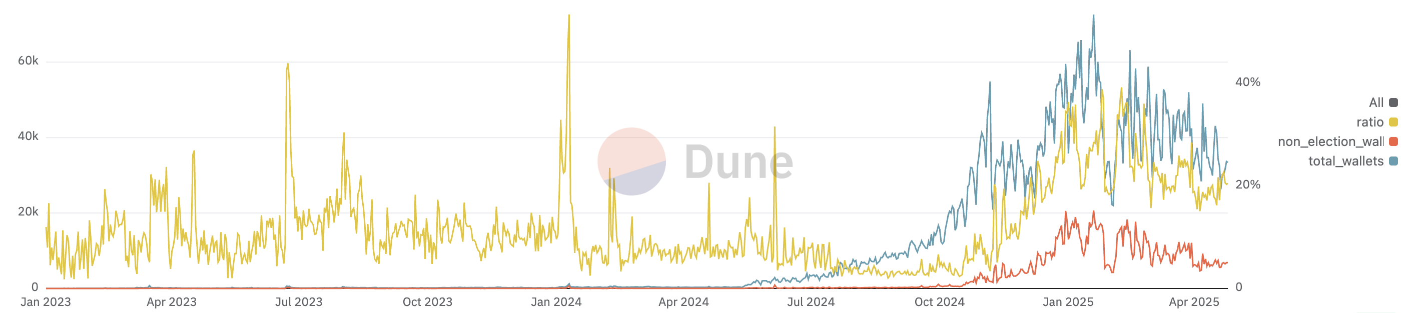 - Election 2024: Volume 500M, only 14% of Polymarket