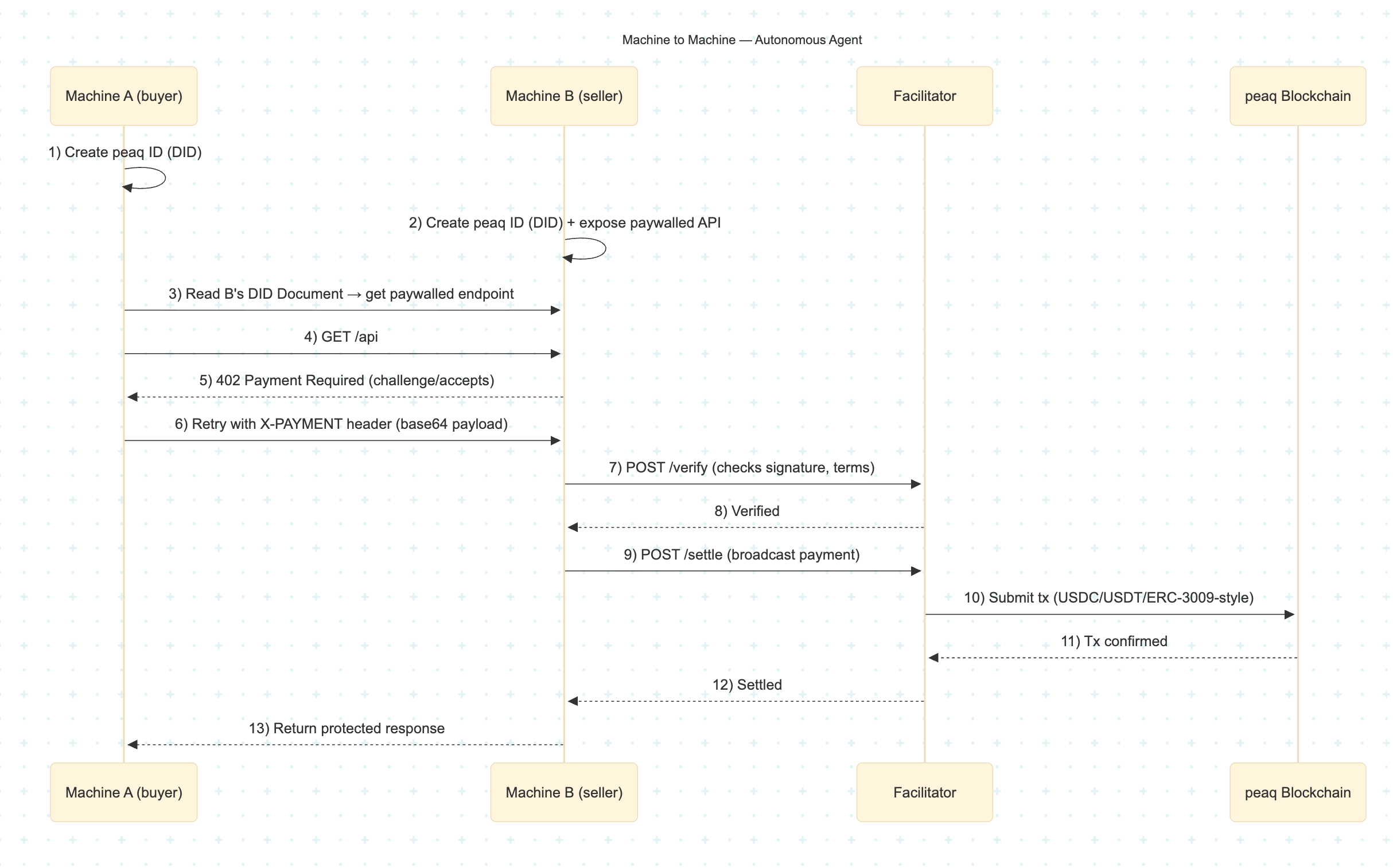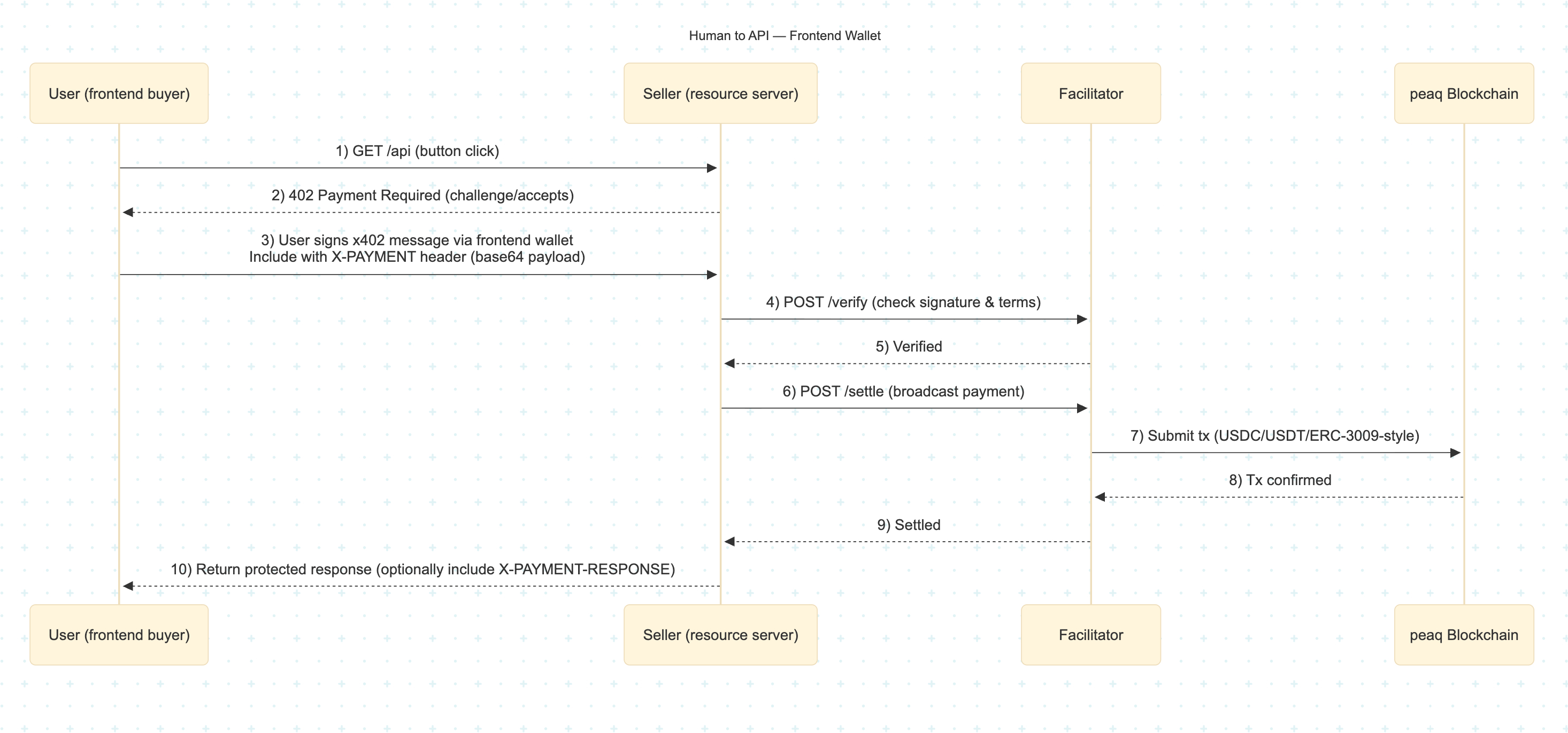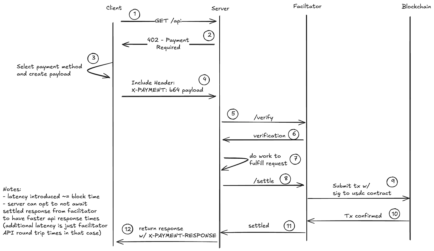 - Settlement confirmation - Once confirmed onchain, the facilitator returns a payment execution response.
