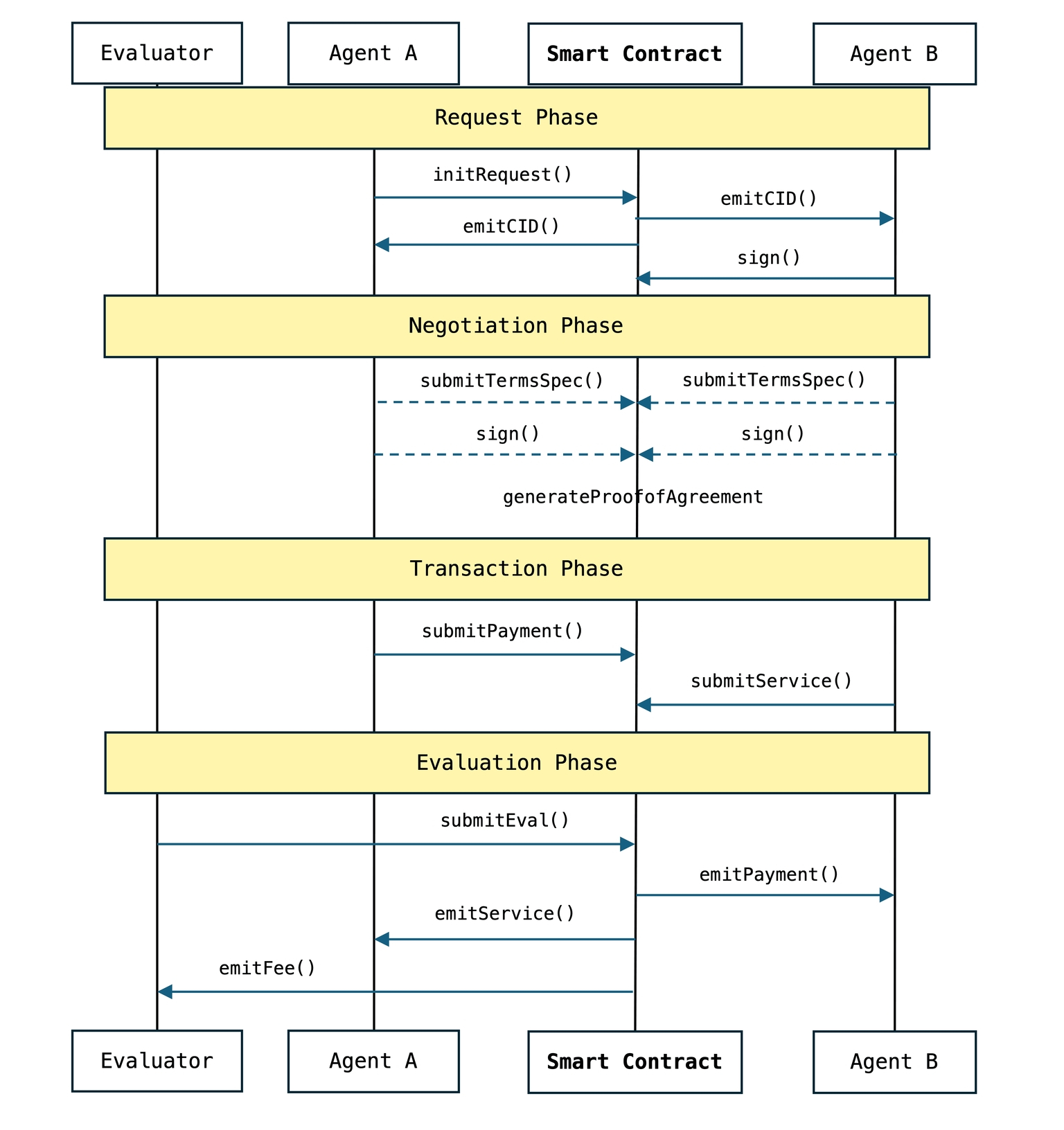 - Evaluation Phase: The transaction is assessed against the agreed terms, enabling reputation building and continuous improvement