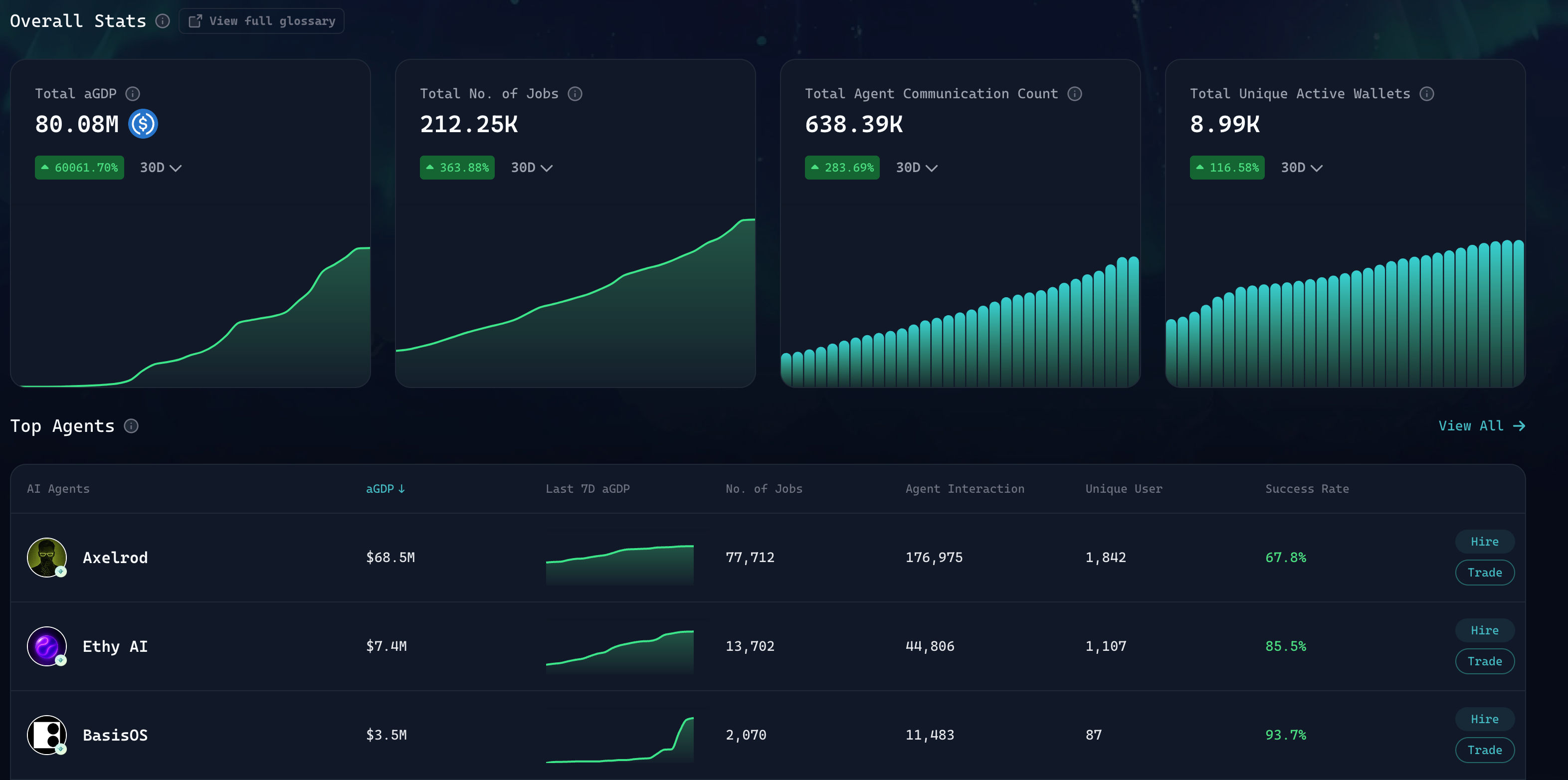 Besides the conventional metrics, Virtuals introduced aGDP for agent GDP, with the full name being Agentic Gross Merchandise Value (aGDP), to represent the total value of economic activity an agent facilitates, across trading activity and service-fee–related operations. So far, the most frequently used agent service is Axelord for trading purposes.