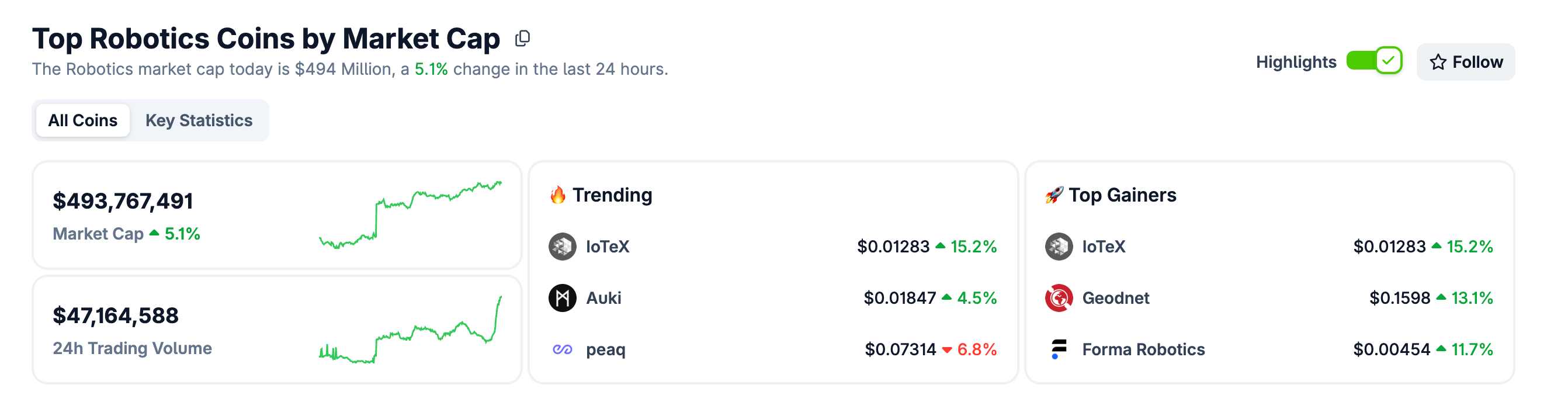 Machine economy is where autonomous devices can own assets, make payments, and coordinate their work via crypto networks. While traditional robotics is a $100+ billion industry, crypto-focused robot projects are still nascent – the total market cap of "robotic coins" only recently surpassed $400 million after market recovery.