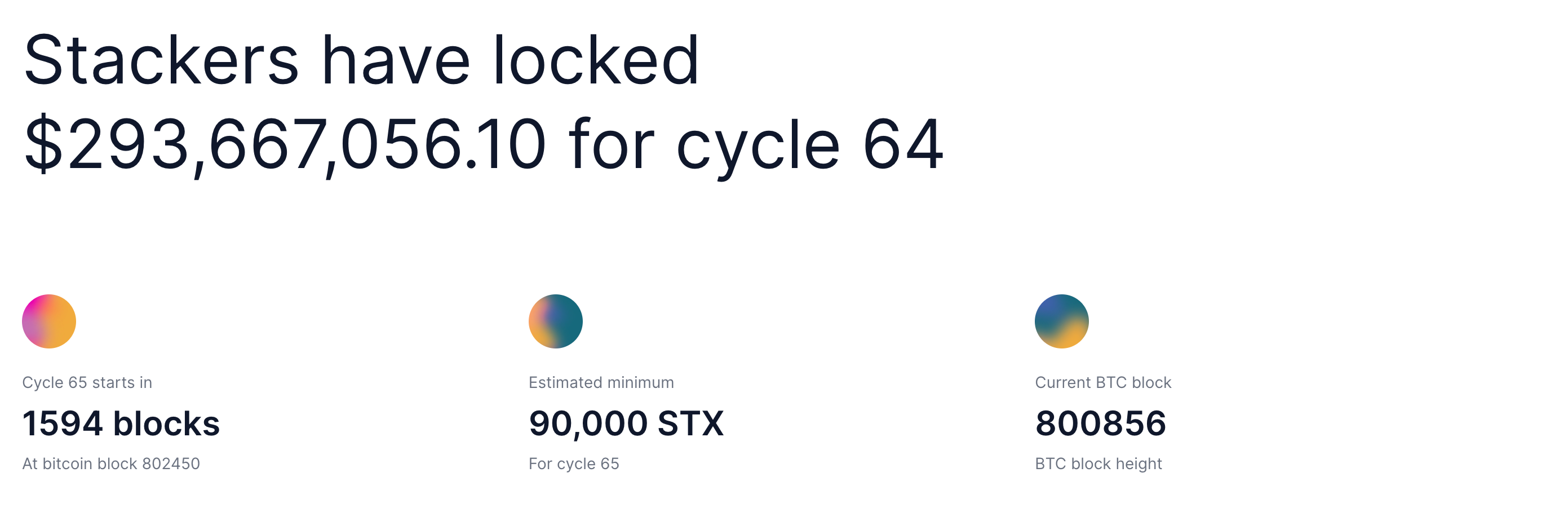 As stated by Stacking Club, each staking cycle lasts approximately two weeks. In cycle #63, 339M STX were staked to earn 2.79945 BTC. This translates to an annual percentage yield (APY) of around 9%, making it a viable strategy for earning BTC.