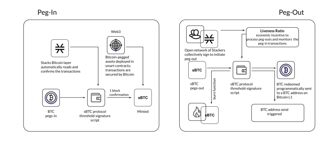 In Peg-In mode, users can send BTC to a peg wallet (P2SH) on the Bitcoin chain controlled by a threshold fraction of stackers, determined by the fraction of locked STX they represent. In Peg-Out mode, the threshold fraction of Stackers fulfills the peg-out by transferring the requested amount of BTC from the peg wallet/script to the desired Bitcoin address. In emergency situations, a portion of the PoX payouts from miners that would have been received by the stackers is redirected to fulfill peg-out requests, ensuring that all outstanding peg-out requests are eventually fulfilled.