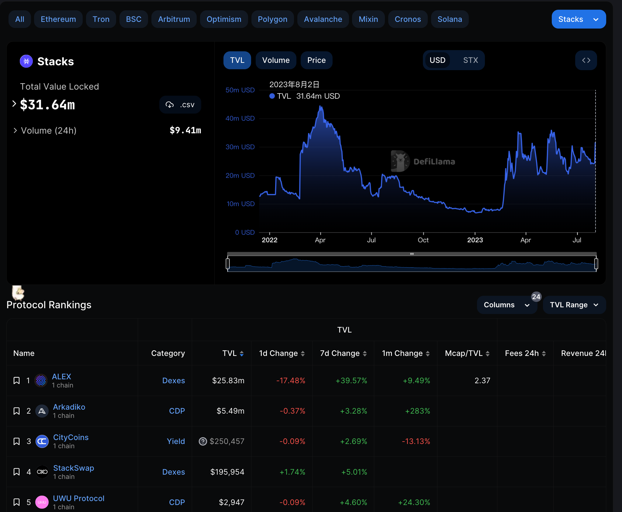 DeFi has provided liquidity and helped support the Stack ecosystem. According to DefiLlama, Stacks has achieved a TVL of 31.64M, surpassing many inactive L1s.
