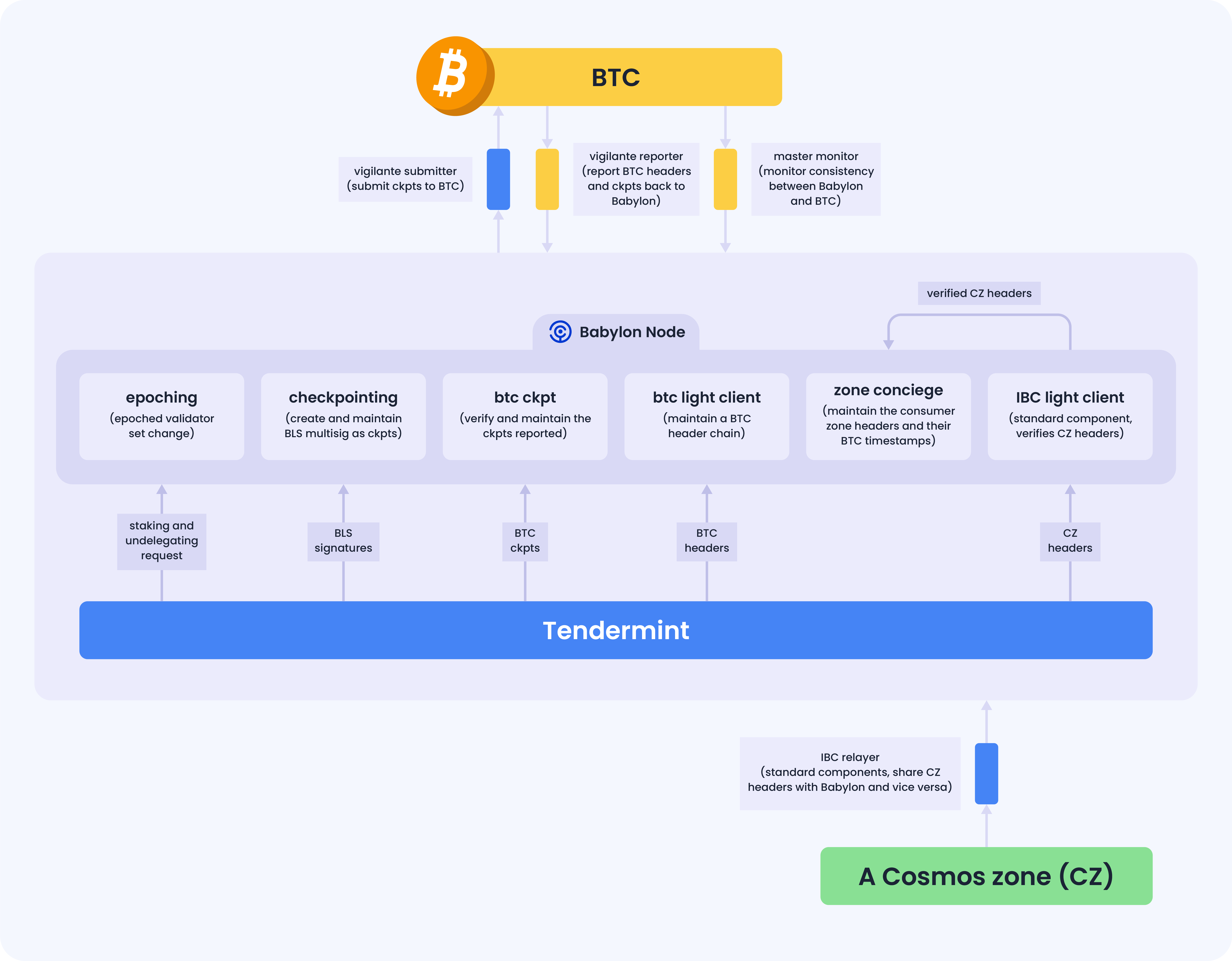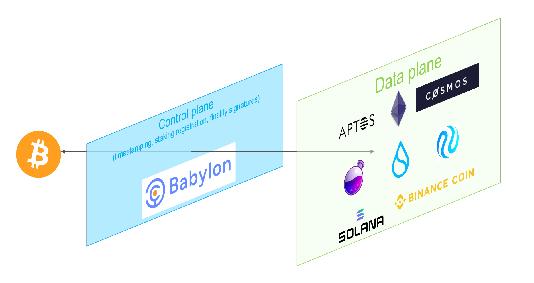 Overall, Babylon is a relayer chain based on Cosmos-SDK that serves as the control plane between Bitcoin and the data plane. For Bitcoin, Babylon is just a child chain attempting to checkpoint on it. For proof-of-stake chains (especially Cosmos zones), Babylon serves as the Cosmos hub.