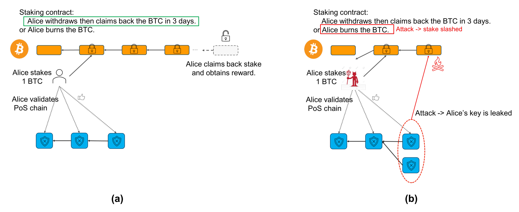 While Babylon leverages the security of Bitcoin to handle emergency situations caused by security breaches.