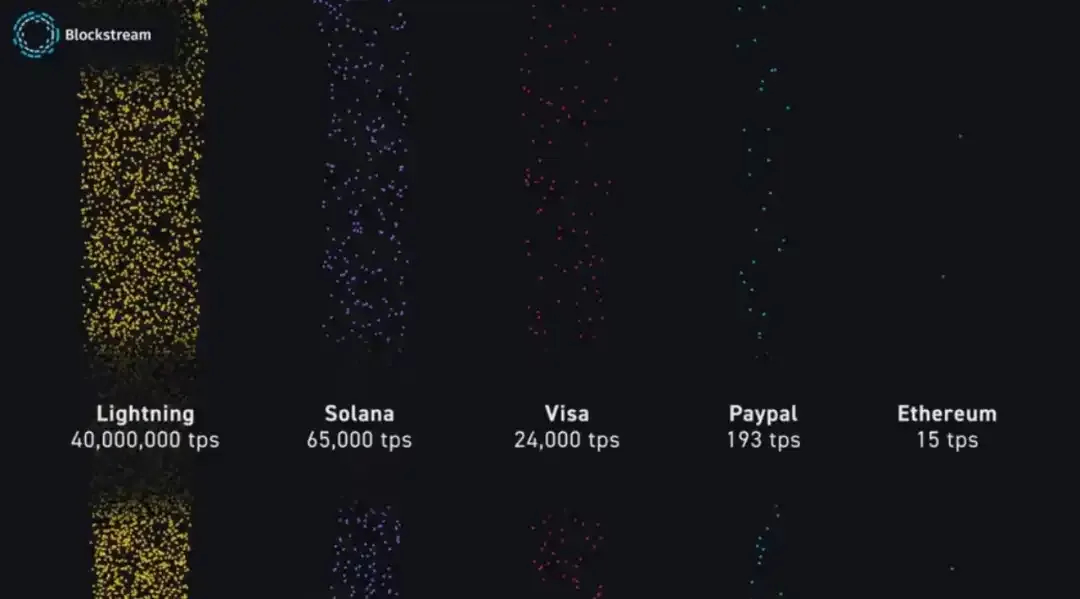 One of the key benefits of the Lightning Network is its ability to enable instant payments between users. Transactions can be processed in real-time, without having to wait for confirmation on the blockchain, making it an attractive option for merchants who can receive payments instantly. According to the stats of Blockstream, Lightning Network can realize 40M tps, far beyond other competitors on the market, including the fast Solana, not to mention Ethereum. And the common global payments right now, Visa is 24K tps, and Paypal is 193 tps. Lightning Network can fully meet the requirements.