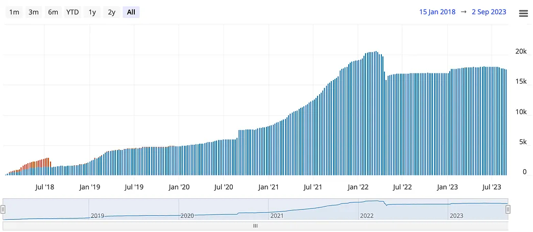 Currently, there are 16,241 nodes, 68,135 channels existing on Lightning Network. And Lightning Network holds 4,690 BTC. That’s 117M TVL if we assume BTC is $25,000. If we are looking back at the whole history, blue line is the TVL counting in USD, we don’t see significant drops like EVM ecosystem, the solid background of Bitcoin supports the Network’s value. From another perspective, orange line is the capacity counting in BTC. It’s a much more steady growth trend even in the bear market. In some well-known retracement of the whole market, Lightning Network seems not to be affected.