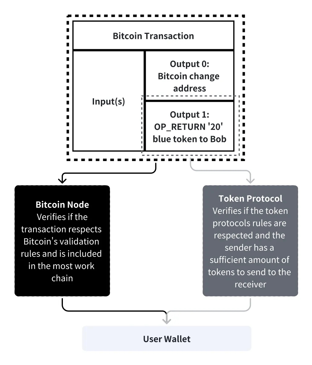 OmniLayer was the earliest protocol that attempted to issue tokens on Bitcoin. In one word, OmniLayer leverages OP_RETURN followed by the token transaction specification, limited to 80 bytes. The token protocol scans the entire Bitcoin transactions and processes the remaining logic.