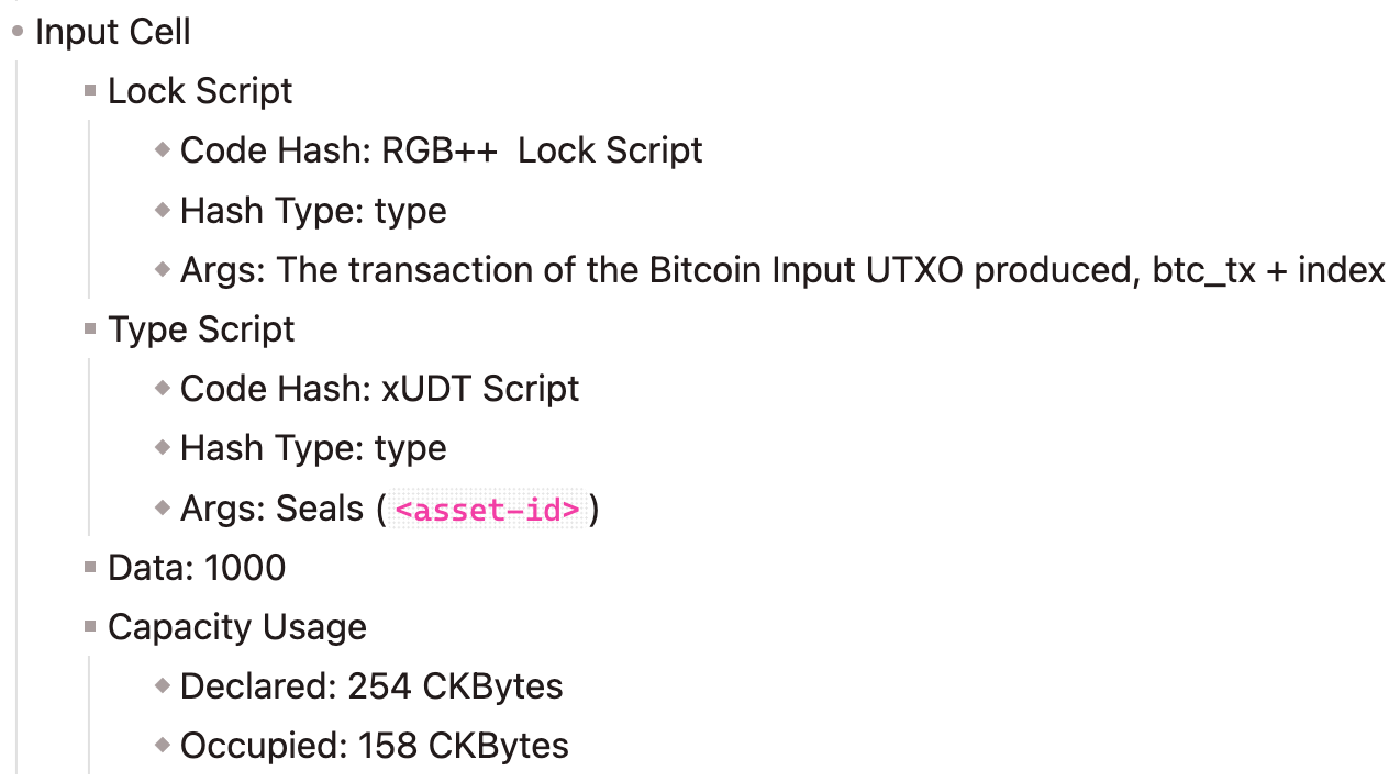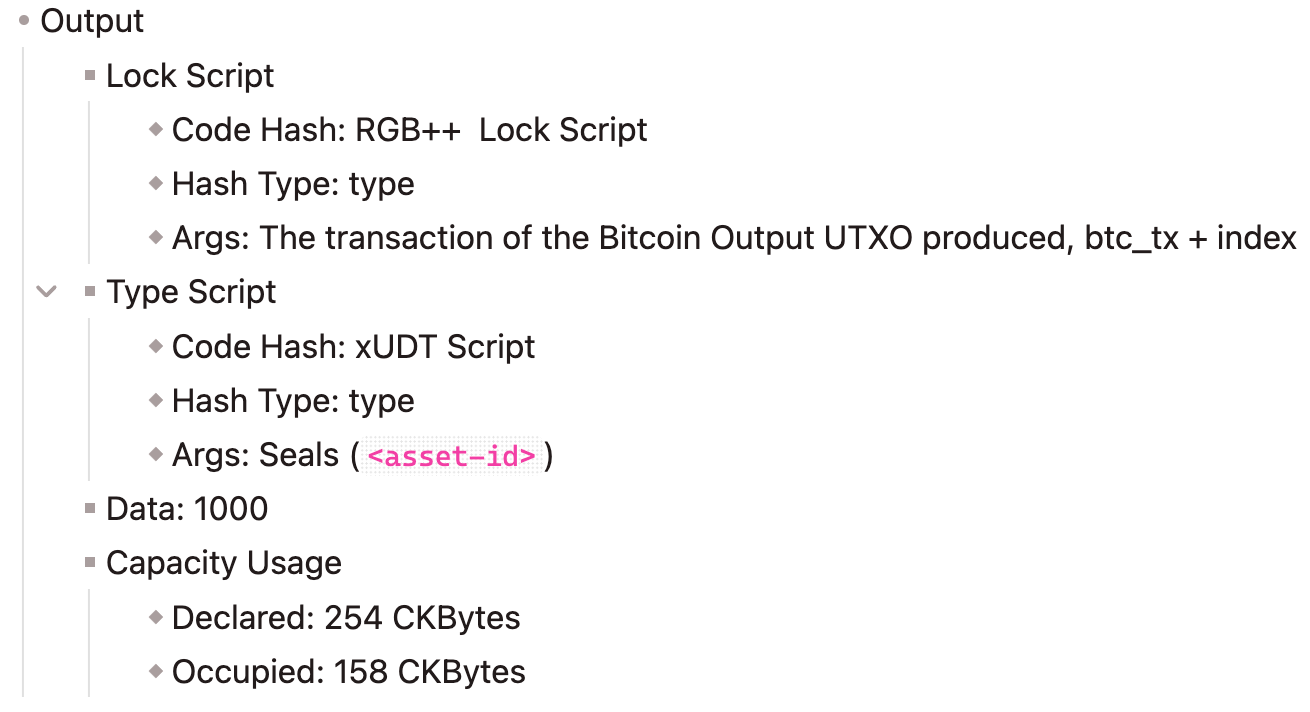 To reflect the issuance and circulation of RGB++ tokens on Nervos, xUDT, the unique token standard within the Nervos ecosystem, is utilized to enhance the functionality and interoperability of assets. The following is a sample configuration of xUDT interoperability, which encompasses the fundamental specifications required to facilitate the seamless integration and utilization of xUDT tokens within the broader Nervos ecosystem. This initiative aims to promote improved asset management and interoperability.