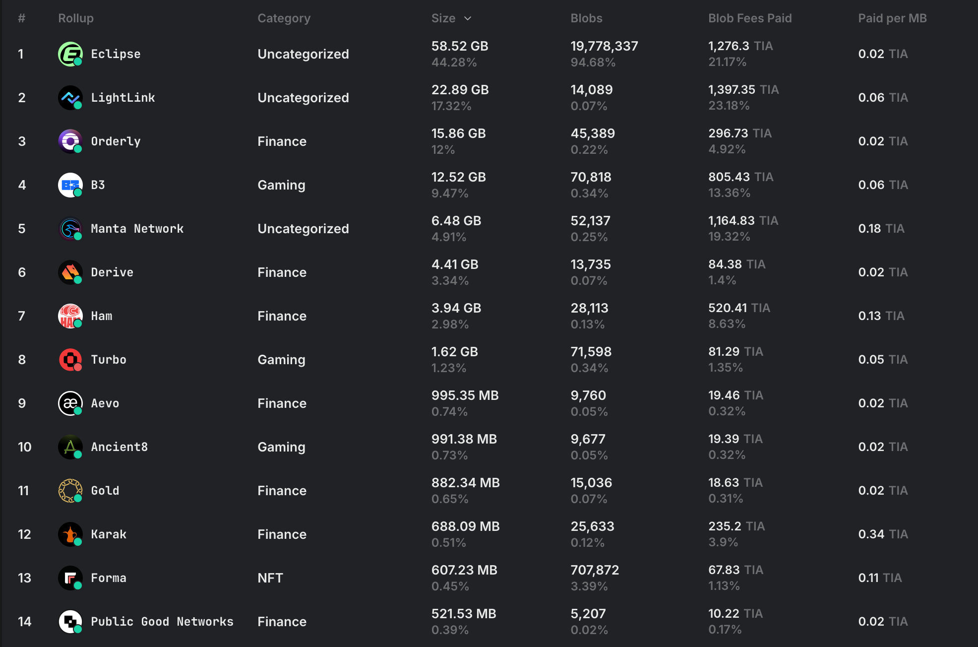 Besides SVM, Eclipse also modify the implementation of RISC Zero's proof system. Rather than maintaining a Merkle tree for state updates, which can create performance bottlenecks, the system focuses on detecting incorrect inputs and outputs through ZK proofs of fraud. This hybrid approach combines elements of both optimistic rollups and ZK systems, maintaining detailed records of transaction inputs and outputs, including account hashes and global state information. Each transaction's origin is tracked through indices, with data recorded on Celestia, enabling full nodes to independently verify state transitions by referencing their own data against Ethereum commitments. This innovative architecture moves away from conventional frameworks like OP Stack, prioritizing efficiency while maintaining security through a more streamlined verification process. Eclipse is already the top 1 rollup using Celestia, paid 1276 $TIA for 58.52GB.