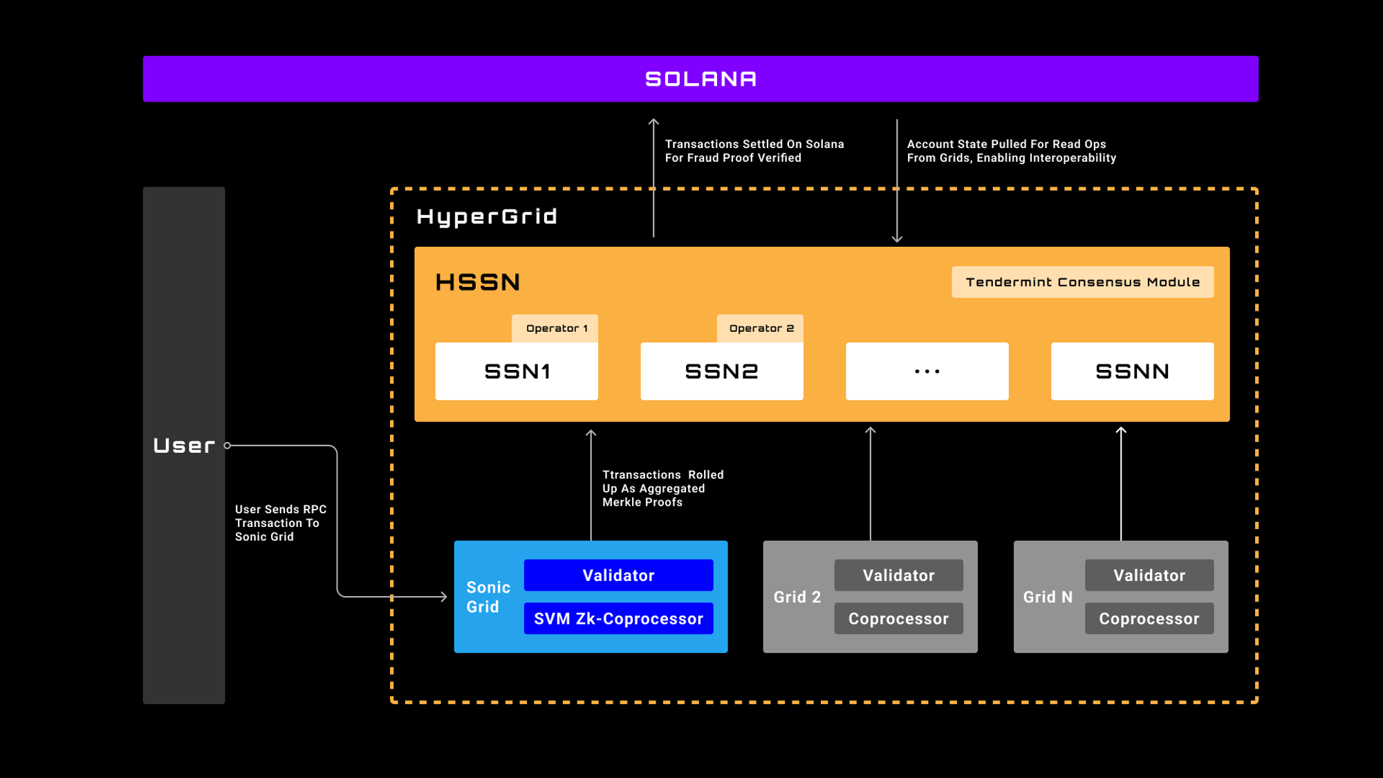 Sonic introduces a distinctive architectural approach through its HyperGrid Shared State Network, combining elements from both Cosmos and Op Stack frameworks to create a specialized gaming infrastructure. The system implements a multi-layered settlement process where Grid nodes send state updates to HyperGrid, which then periodically synchronizes with Solana. This creates a hierarchical settlement structure that balances efficiency with security.