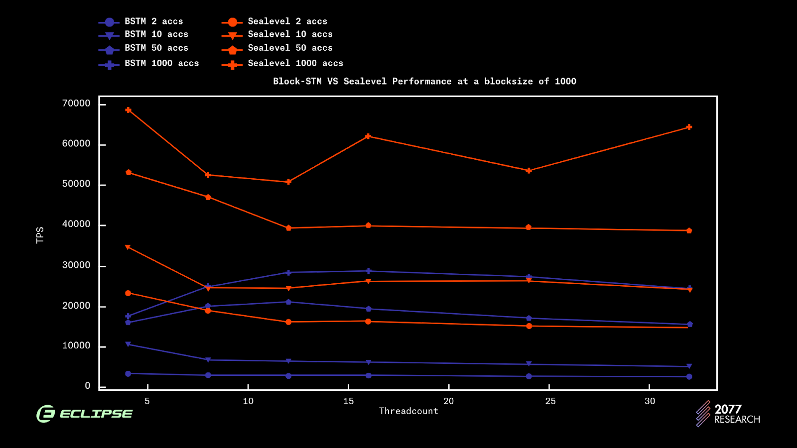 The key to Sealevel's efficiency is its preset dependency system. By requiring smart contracts to declare their state dependencies upfront, Sealevel can intelligently process non-conflicting transactions simultaneously. This contrasts sharply with solutions like Block-STM, which rely on transaction re-execution to identify conflicts. Stress testing demonstrates Sealevel's superior performance, particularly as block sizes increase, showing significantly better throughput across both small (1k) and large (10k) block sizes.