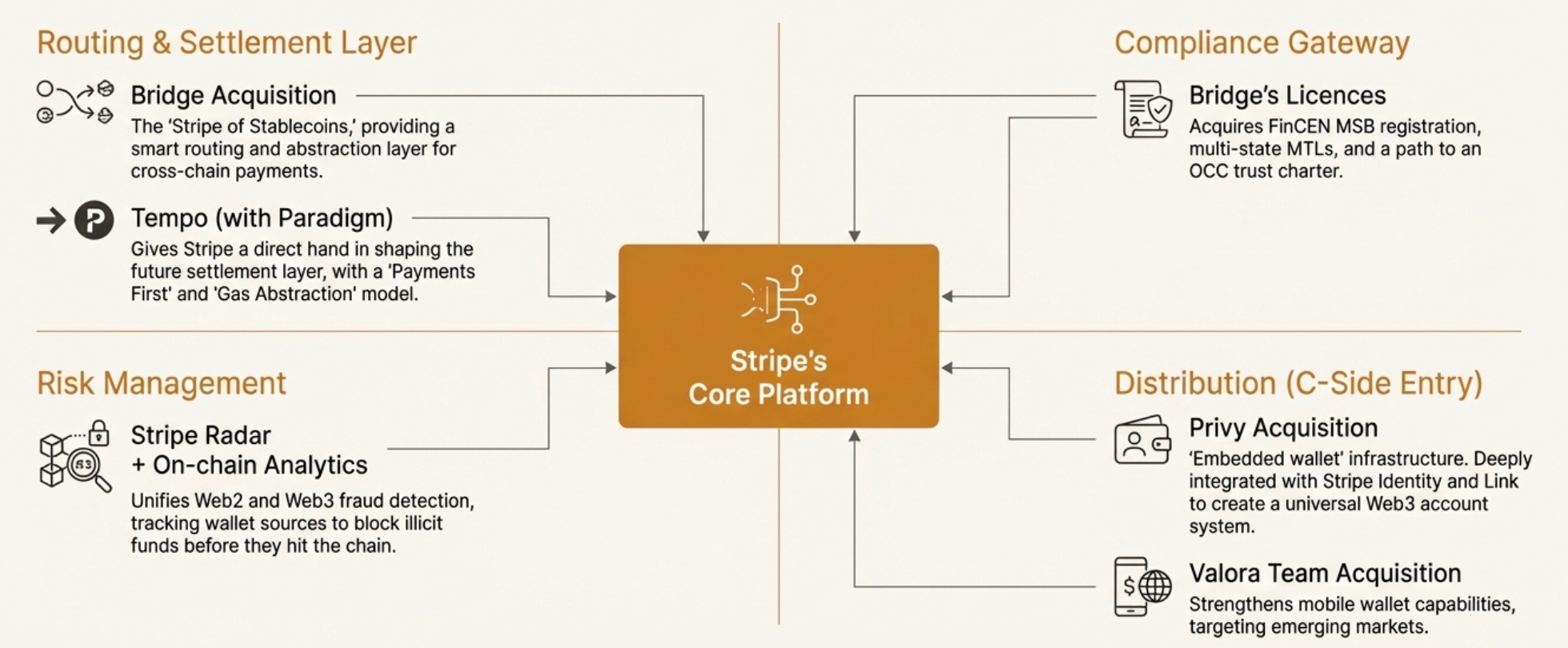 Stripe's key moat is its powerful Smart Routing, supercharged by the Bridge acquisition. Bridge acts as the "Stripe of Stablecoins," offering an abstraction layer for cross-chain interoperability. Post-integration, Stripe merchants can accept funds from any supported chain without managing multiple wallets or bridging. Bridge handles asset routing and conversion in the background. The partnership with Paradigm on Tempo will further give it initiative in the settlement layer.