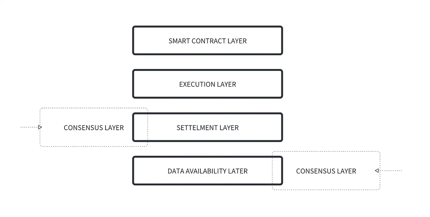 When looking at the high level, traditional monolithic blockchain can be divided into four layers: smart contract layer, execution layer, settlement layer, and data availability layer. Each layer plays a crucial role in the modular narrative. The consensus layer, which involves agreeing on the order of transactions, is usually coupled with the settlement layer or data availability layer.