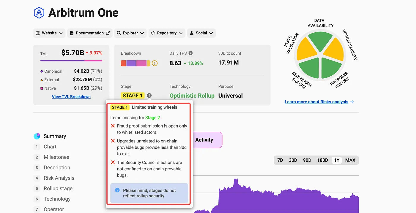 Arbitrum is the leading protocol that uses fraud proofs and has the highest Total Value Locked (TVL) in the market. It has completed the fraud proof system but has not yet been used on the mainnet, so the outcome is uncertain. If we need to handle disputes on L1, the state of the rollup is essentially suspended, meaning the blockchain is unavailable for a maximum of 7 days. Even in the traditional Internet industry, a system breakdown for 7 days is unacceptable. Arbitrum can not risk losing users, so it does not allow permissionless proof submission. Only whitelisted actors can propose proofs.