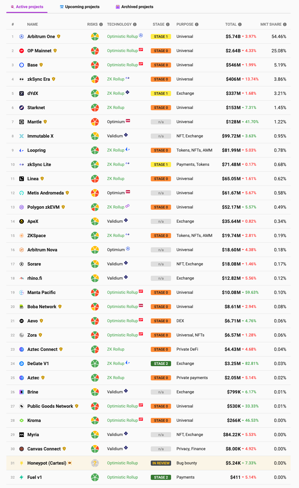 Simply put, using Ethereum as a DA layer gives legitimacy, while not using Ethereum lacks legitimacy. The tendency and marketing influence of the Ethereum community actually work. Let’s take a look at all of the rollups listed on L2beat, a leading protocol mostly based on Ethereum. Although the stage column (Security Level: Stage 0 < Stage 1 < Stage 2) indicates that they are not very secure, they still receive attention. The most extreme case is Fuel, which chooses Celestia as its DA but doesn’t attract much attention or capital inflow, despite building the safest rollup. So the truth behind the so-called legitimacy is that Ethereum is trying to block DA competitors in order to maintain its position.