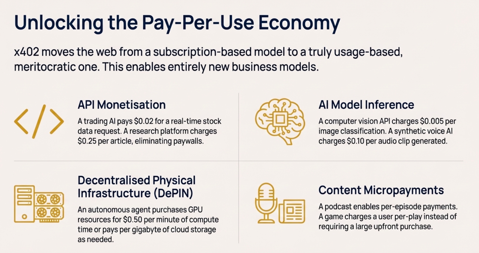 Strategically, x402 is a bet that the SaaS and data economy will move away from heavy subscriptions toward a more merit-based, pay-per-use world. Today, an agent that needs one specific data point from a news API may have to buy a $50 per month subscription. In an x402 future, that agent can pay $0.01 (or less) for a single call. If the combination of gas and facilitator fees can be kept below the value of the data, this creates a hyper-competitive market where services compete on the quality and price of each individual request rather than long-term lock-in. x402 removes much of the friction around accounts, prepaid credits and invoicing that currently protects incumbents.
