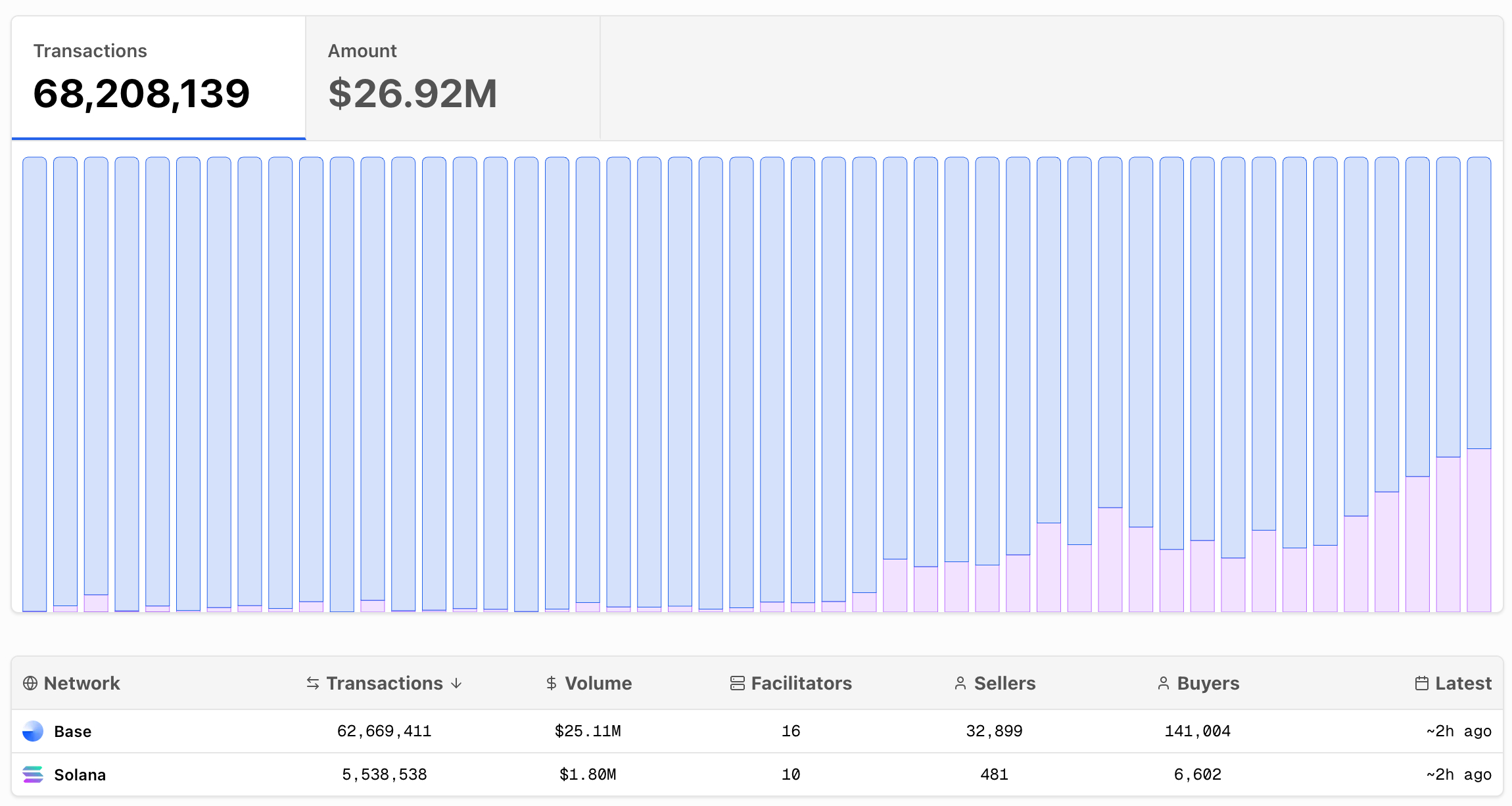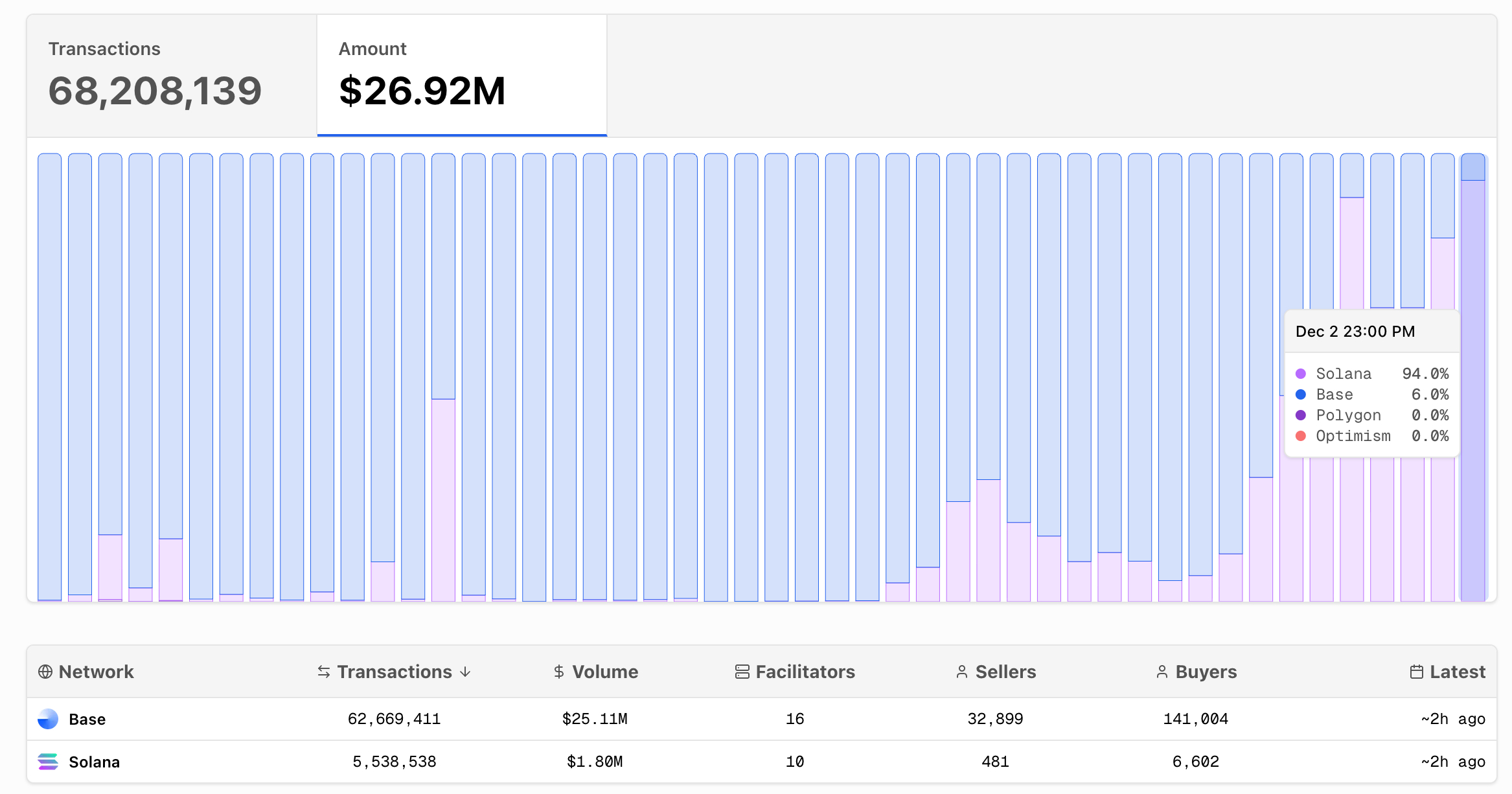 Base was the default network for early x402 testing. Coinbase began subsidizing facilitator infrastructure on Base very early, which made it the easiest place to experiment. Historically, Base has processed ~62.7M x402-related transactions compared to Solana’s ~5.5M (about an 11× difference), and has settled around $25.11M in volume versus Solana’s $1.80M.