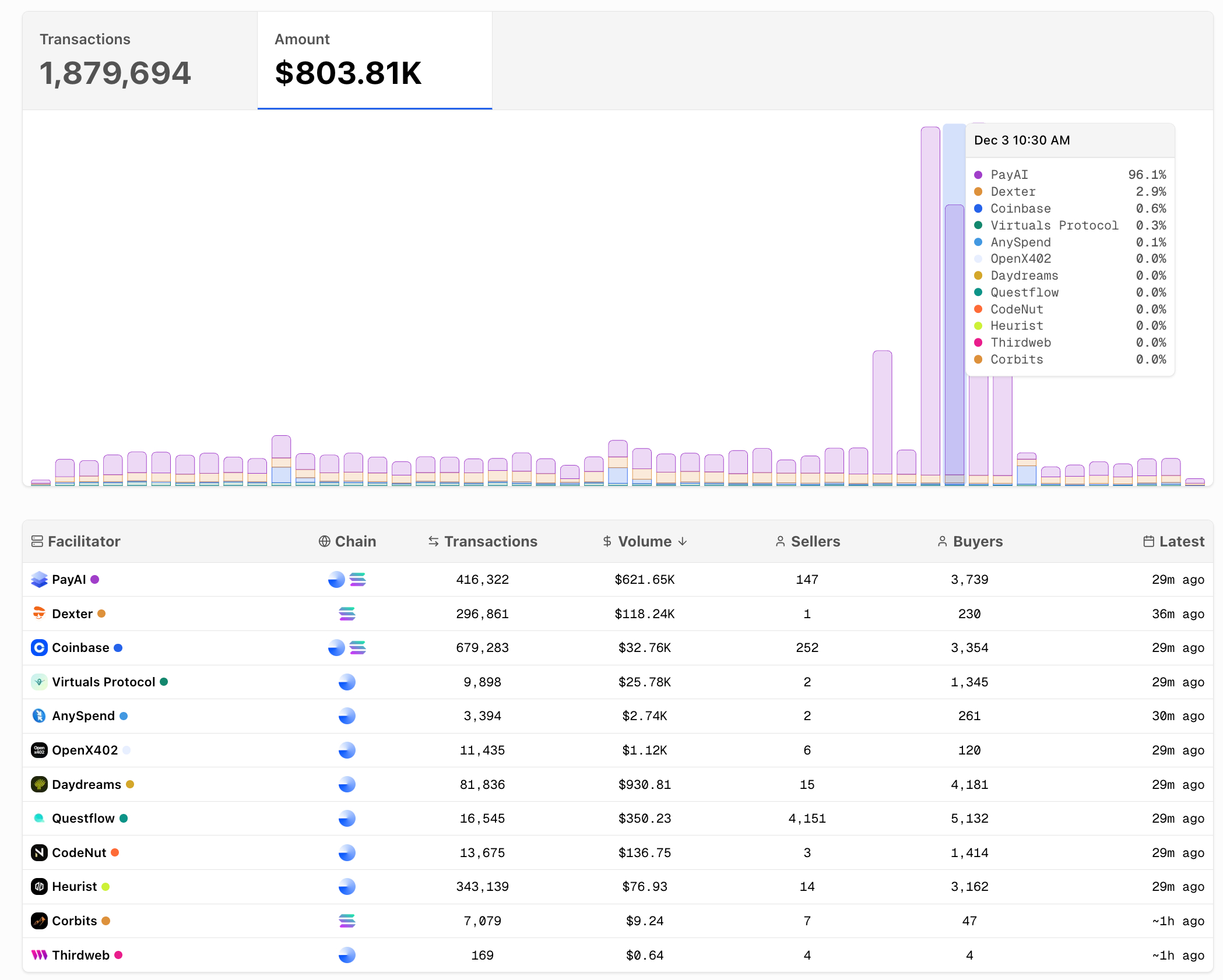 The reason Solana can now have much more recent volume but fewer historical transactions than Base is that the leading facilitators in the current wave come from the Solana ecosystem, especially PAYAI and Dexter. Coinbase’s own facilitator has also added Solana support, further contributing to the shift.