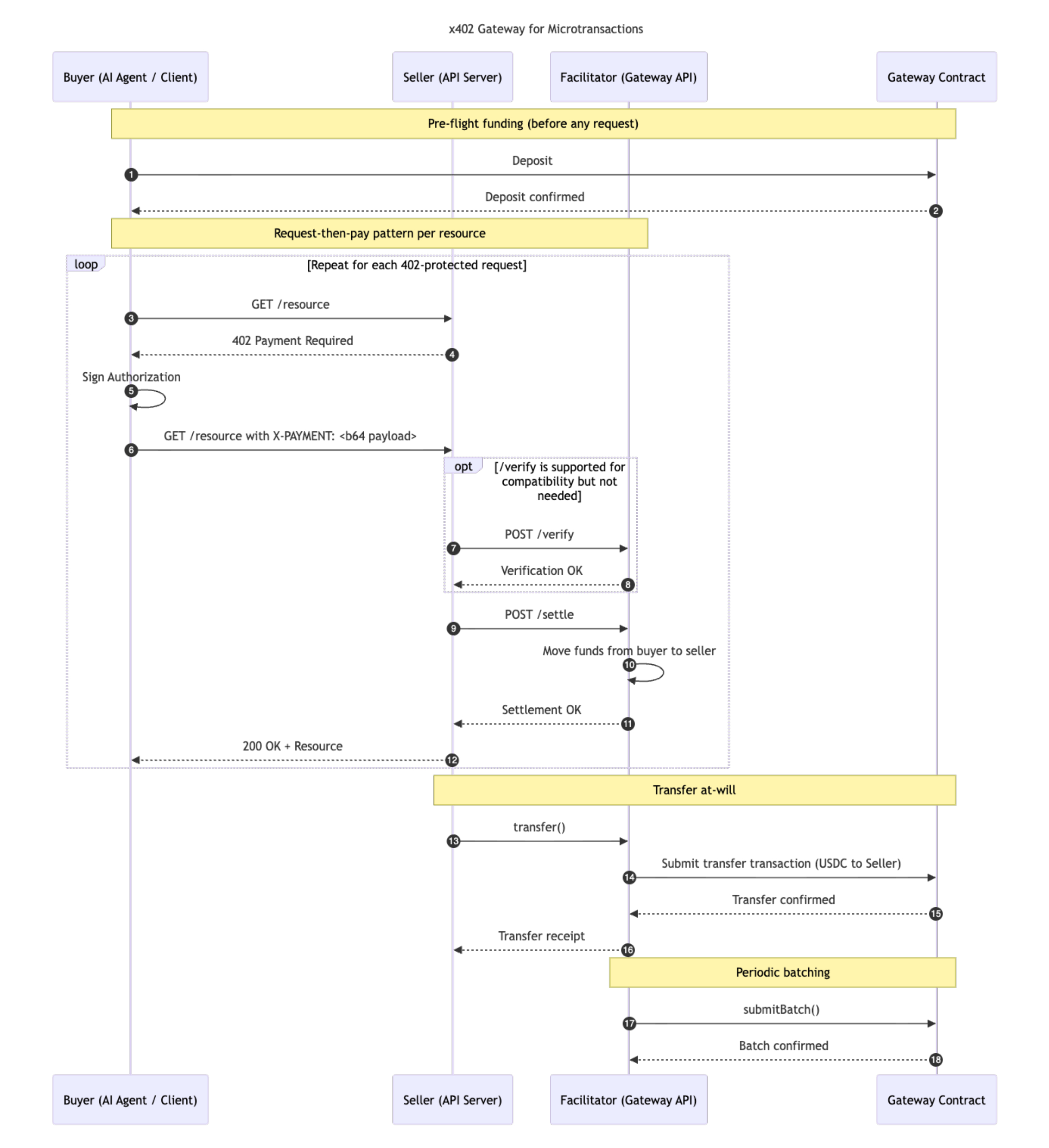 - Workflow: The Client signs an off-chain authorization. The Facilitator aggregates these authorizations and settles them in a batch at a later time.