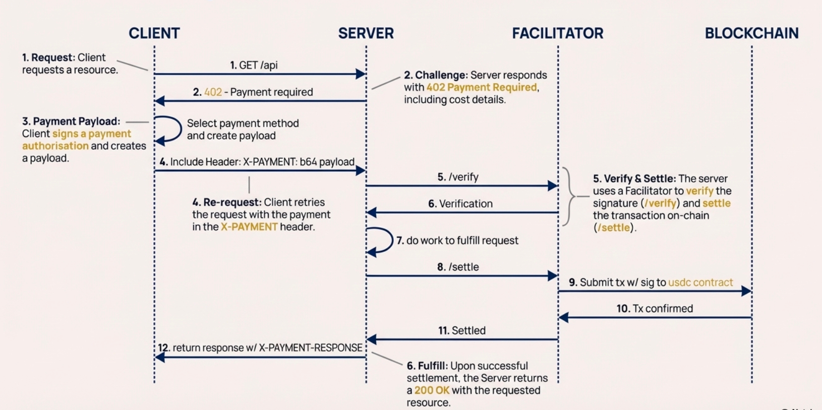 The facilitator is the defining architectural innovation of x402 because it bridges the synchronous world of HTTP and the asynchronous world of blockchains. A pure on‑chain design would force servers to wait for blocks and confirmations before responding, which does not fit real‑time APIs. With a facilitator in the middle, servers can rely on fast off‑chain verification of payment payloads and make their own choices about when to deliver content and when to wait for stronger finality. In production, the facilitator must also handle queuing, batching and error handling, otherwise the economic and reliability benefits of x402 cannot be realized.
